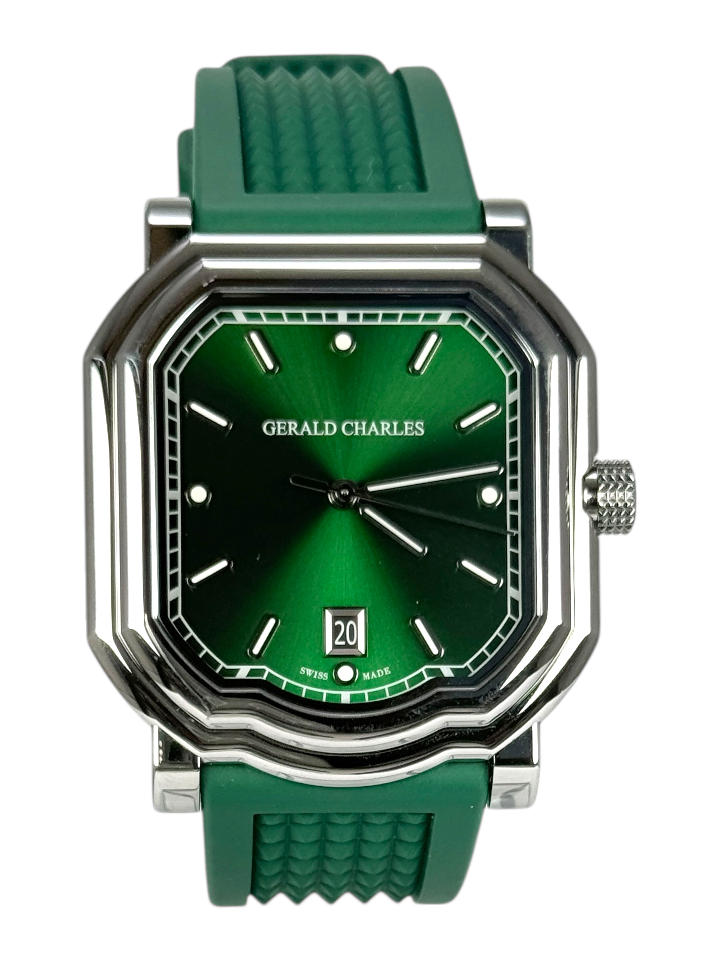 This Gerald Charles Maestro GC Sport GC2.0-A-02 has a green dial and a rubber strap. This Gerald Charles has undergone a thorough inspection of water resistance, accuracy, functionality and condition to determine the level of reconditioning required to meet our strict standards. It has also been referenced against technical documents and manufacturer records where available to ensure authenticity and a clean history. All our watches have a 24-month warranty for your peace of mind.