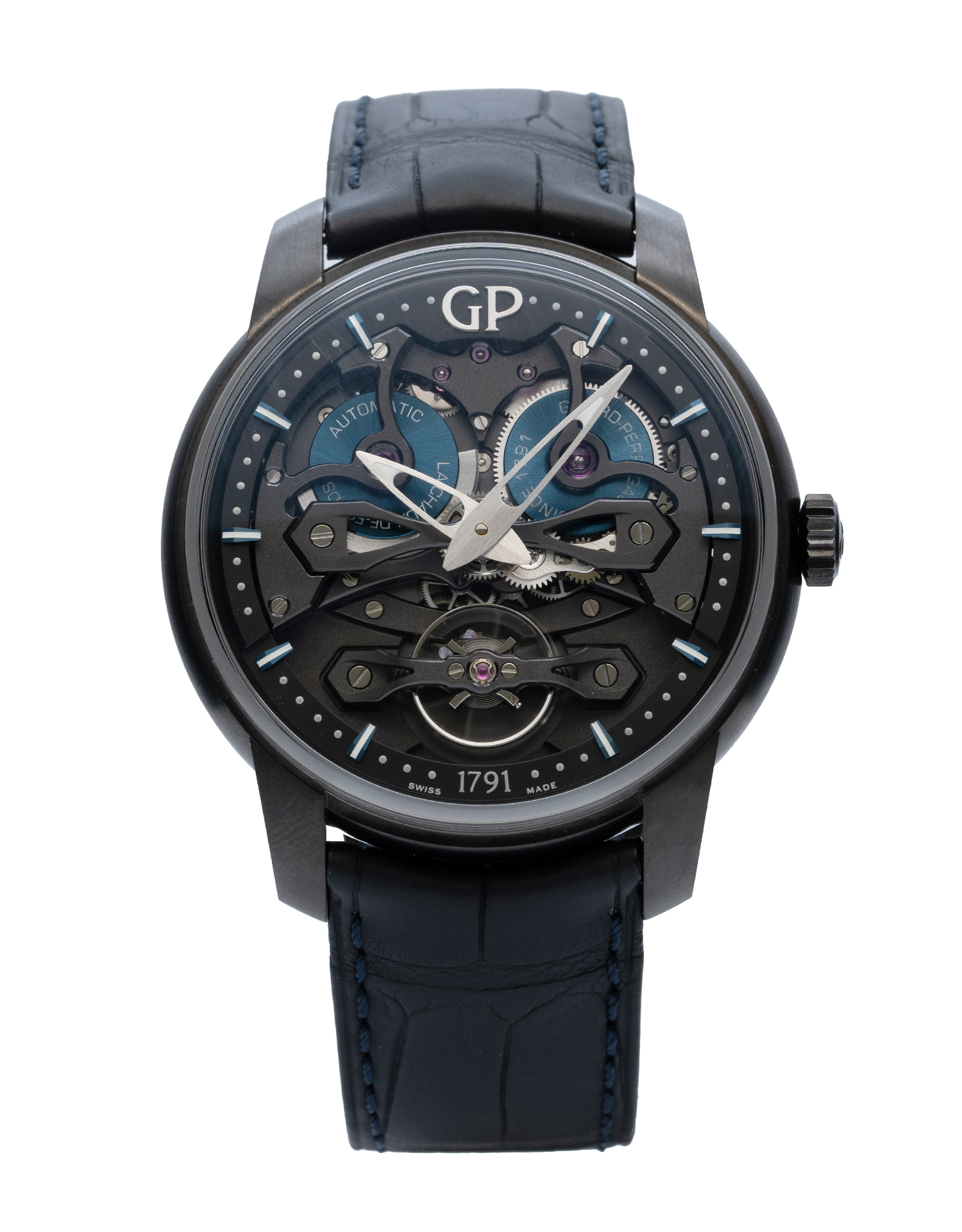 This Girard Perregaux Bridges 84000-21-632-BH6A has a black dial and a leather strap. This Girard Perregaux has undergone a thorough inspection of water resistance, accuracy, functionality and condition to determine the level of reconditioning required to meet our strict standards. It has also been referenced against technical documents and manufacturer records where available to ensure authenticity and a clean history. All our watches have a 24-month warranty for your peace of mind.