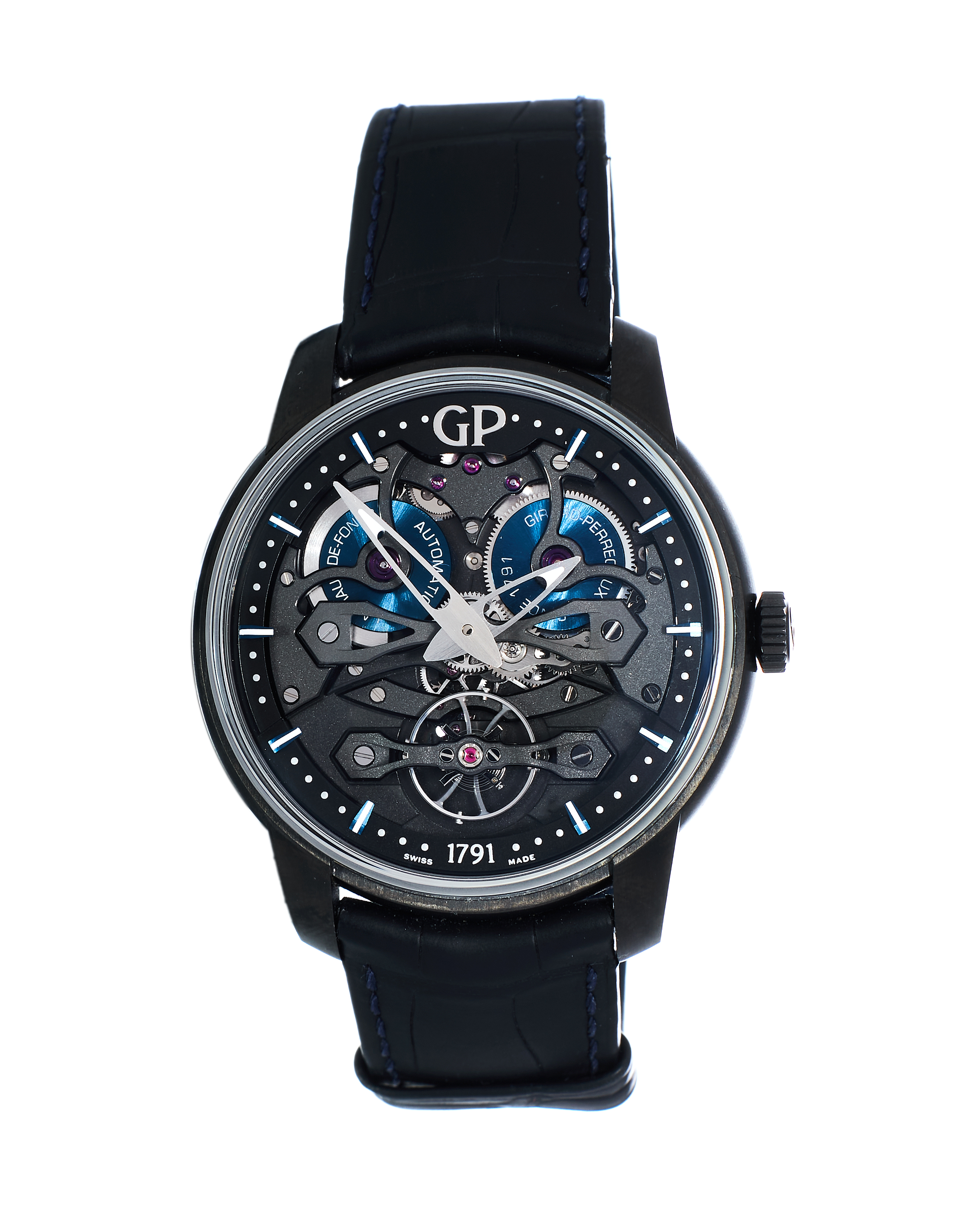 This Girard Perregaux Bridges 84000-21-632-BH6A has a black dial and a leather strap. This Girard Perregaux has undergone a thorough inspection of water resistance, accuracy, functionality and condition to determine the level of reconditioning required to meet our strict standards. It has also been referenced against technical documents and manufacturer records where available to ensure authenticity and a clean history. Our watches have a 24-month warranty for your peace of mind, in conjunction with any remaining manufacturer’s warranty from new or from service.