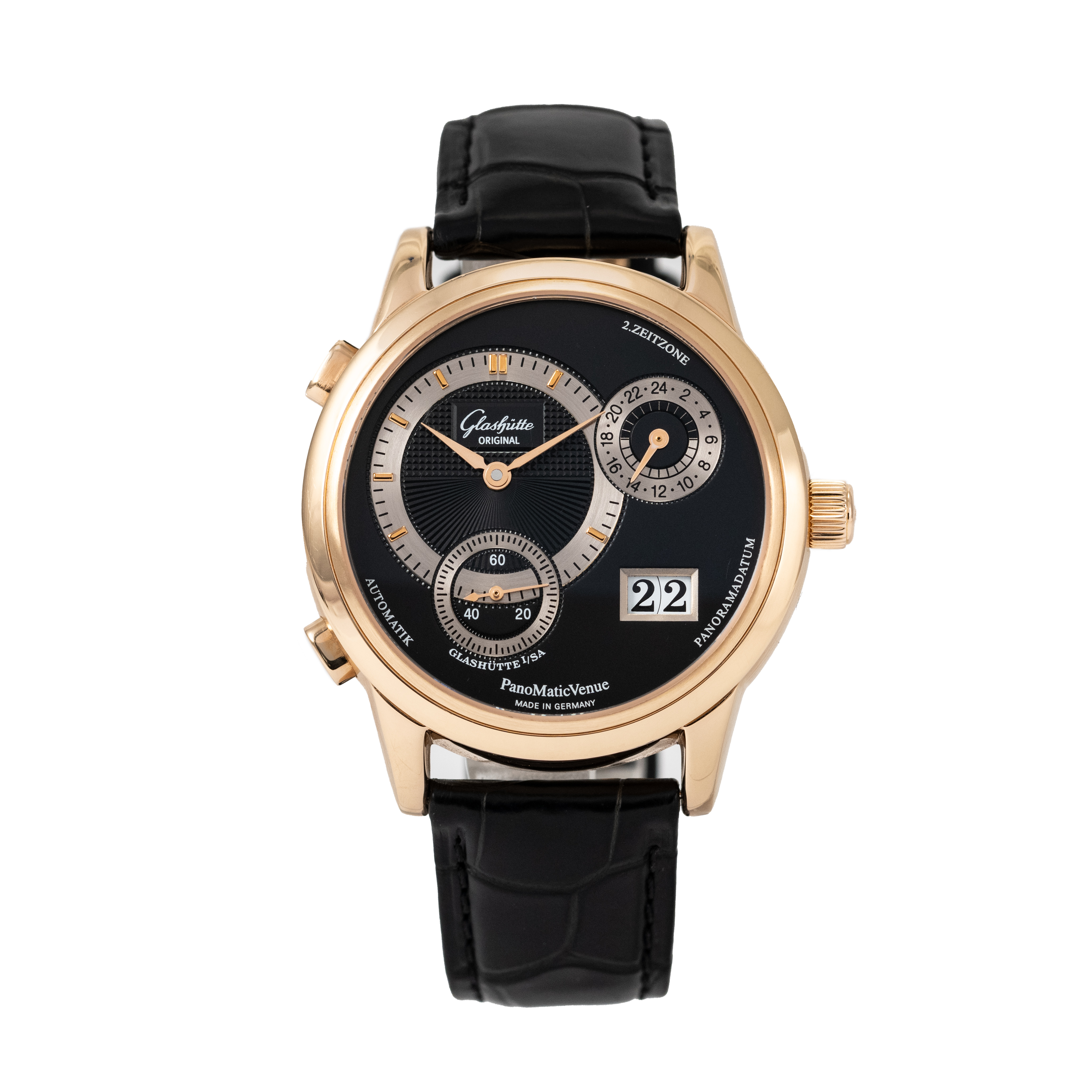 This Glashutte Original PanoMaticVenue 90-04-20-05-04 has a black baton dial and a leather strap. This Glashutte Original has undergone a thorough inspection of water resistance, accuracy, functionality and condition to determine the level of reconditioning required to meet our strict standards. It has also been referenced against technical documents and manufacturer records where available to ensure authenticity and a clean history. All our watches have a 24-month warranty for your peace of mind.