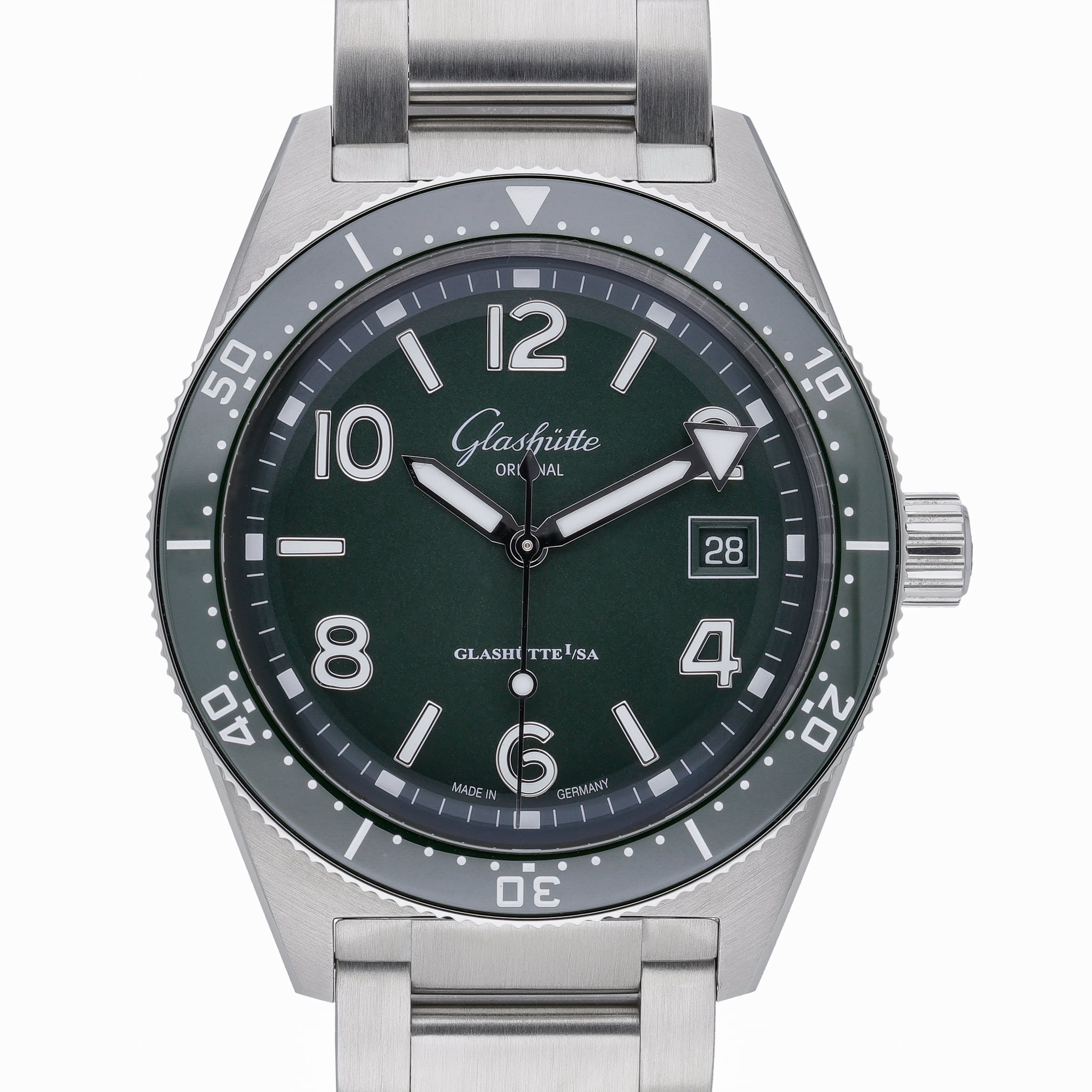 This Glashutte Original SeaQ 1-39-11-13-83-70 has a green arabic dial and a bracelet strap. This Glashutte Original has undergone a thorough inspection of water resistance, accuracy, functionality and condition to determine the level of reconditioning required to meet our strict standards. It has also been referenced against technical documents and manufacturer records where available to ensure authenticity and a clean history. Our watches have a 24-month warranty for your peace of mind, in conjunction with any remaining manufacturer’s warranty from new or from service.