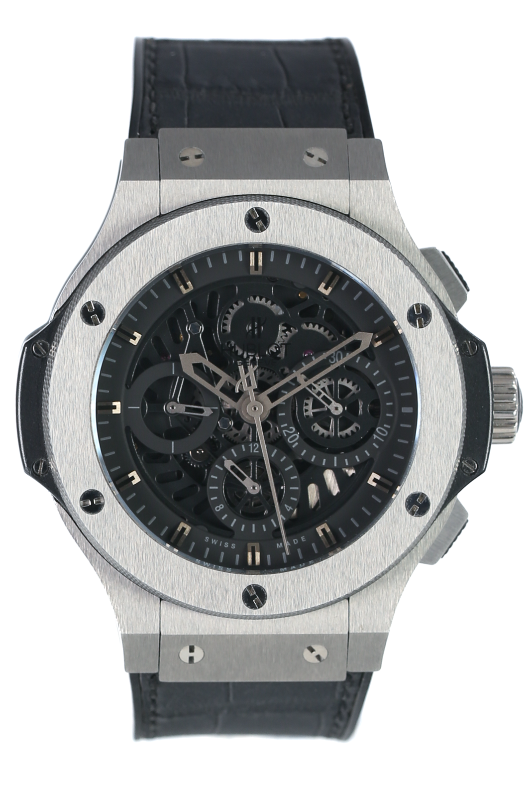 This Hublot Aero Bang 310.KX.1140.RX has a black dial and a rubber strap. This Hublot has undergone a thorough inspection of water resistance, accuracy, functionality and condition to determine the level of reconditioning required to meet our strict standards. It has also been referenced against technical documents and manufacturer records where available to ensure authenticity and a clean history. All our watches have a 24-month warranty for your peace of mind.