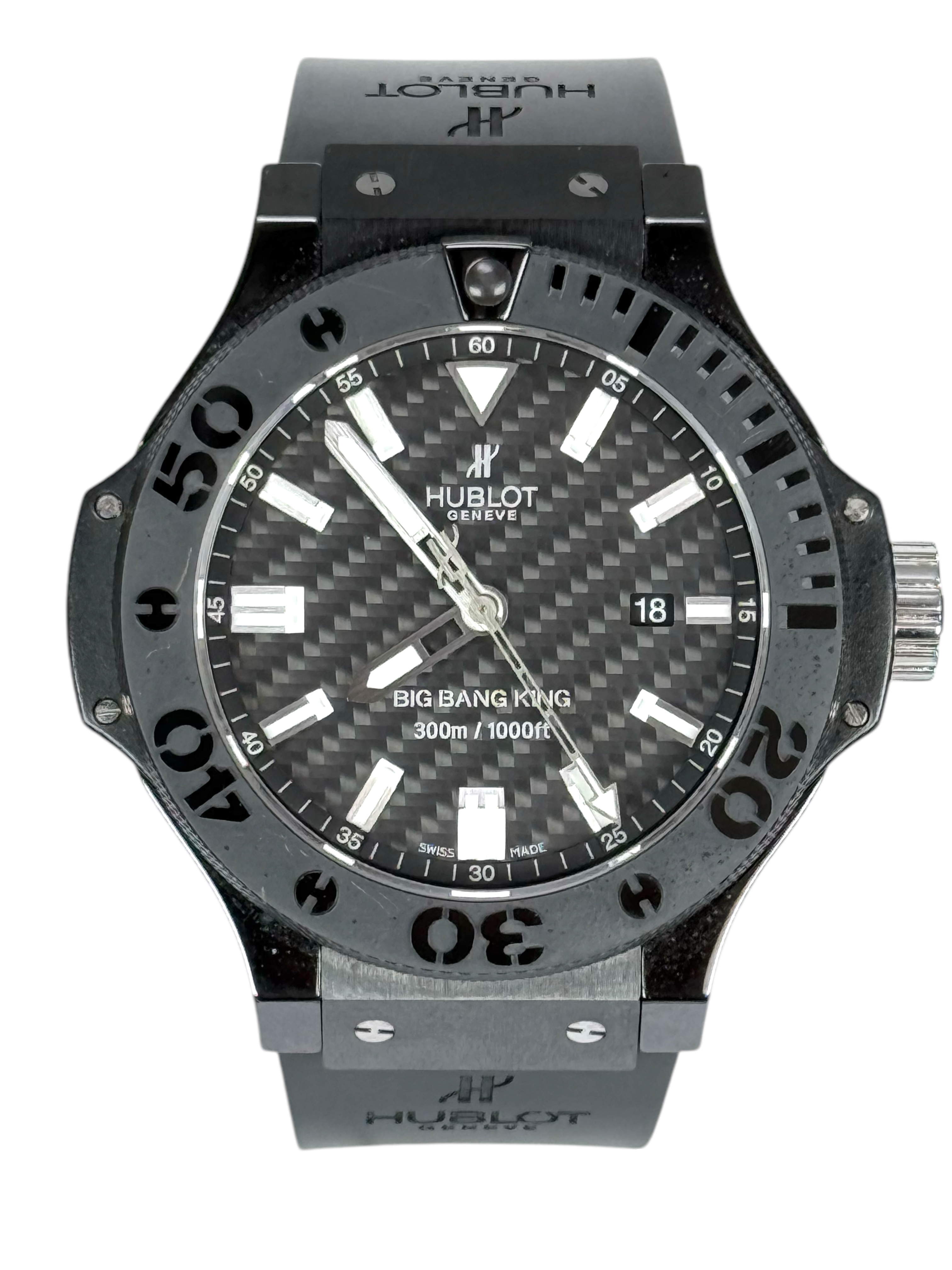 This Hublot Big Bang 322.CM.1770.RX has a black carbon dial and a rubber strap. This Hublot has undergone a thorough inspection of water resistance, accuracy, functionality and condition to determine the level of reconditioning required to meet our strict standards. It has also been referenced against technical documents and manufacturer records where available to ensure authenticity and a clean history. All our watches have a 24-month warranty for your peace of mind.