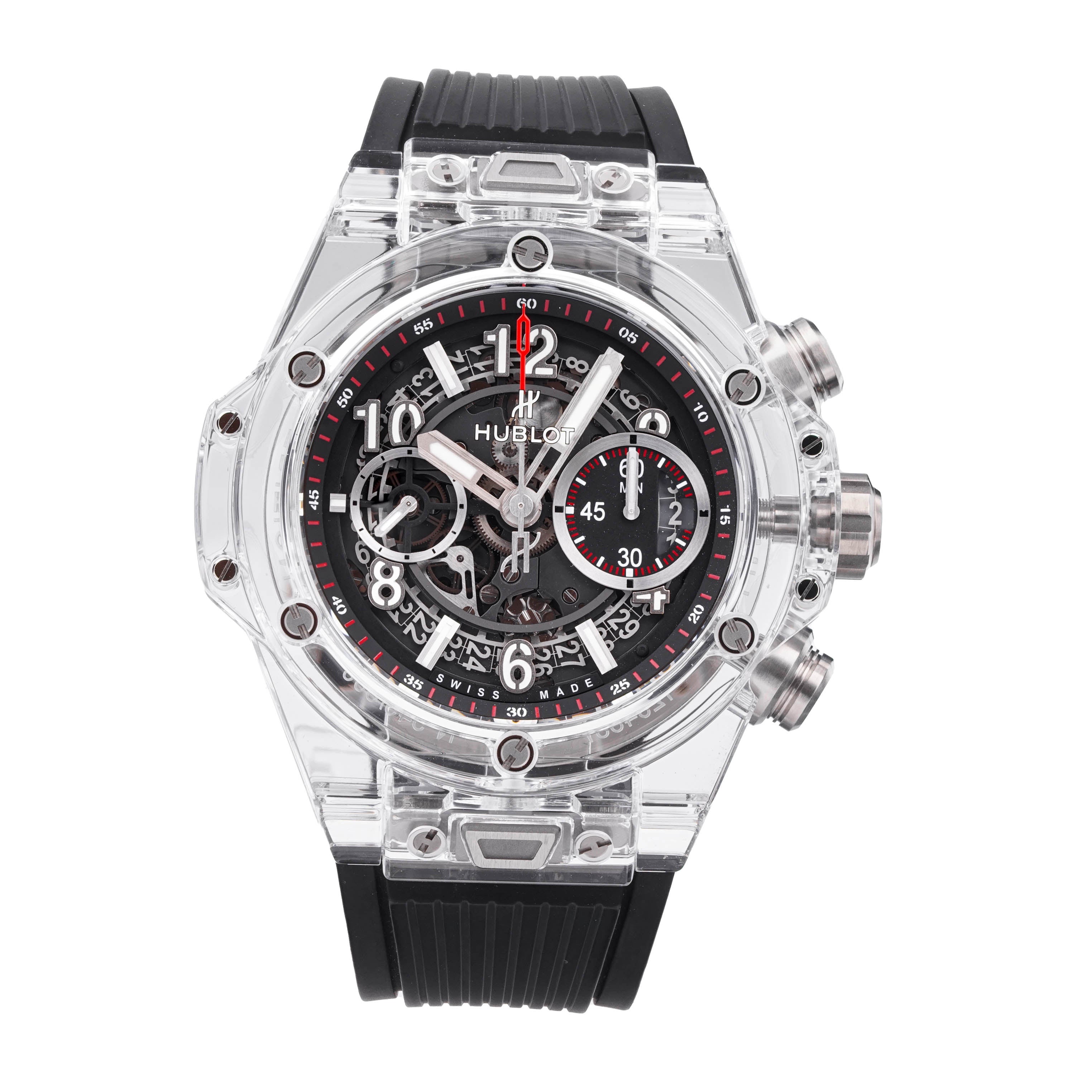 This Hublot Big Bang 411.JX.1170.RX has a black arabic dial and a rubber strap. This Hublot has undergone a thorough inspection of water resistance, accuracy, functionality and condition to determine the level of reconditioning required to meet our strict standards. It has also been referenced against technical documents and manufacturer records where available to ensure authenticity and a clean history. All our watches have a 24-month warranty for your peace of mind.