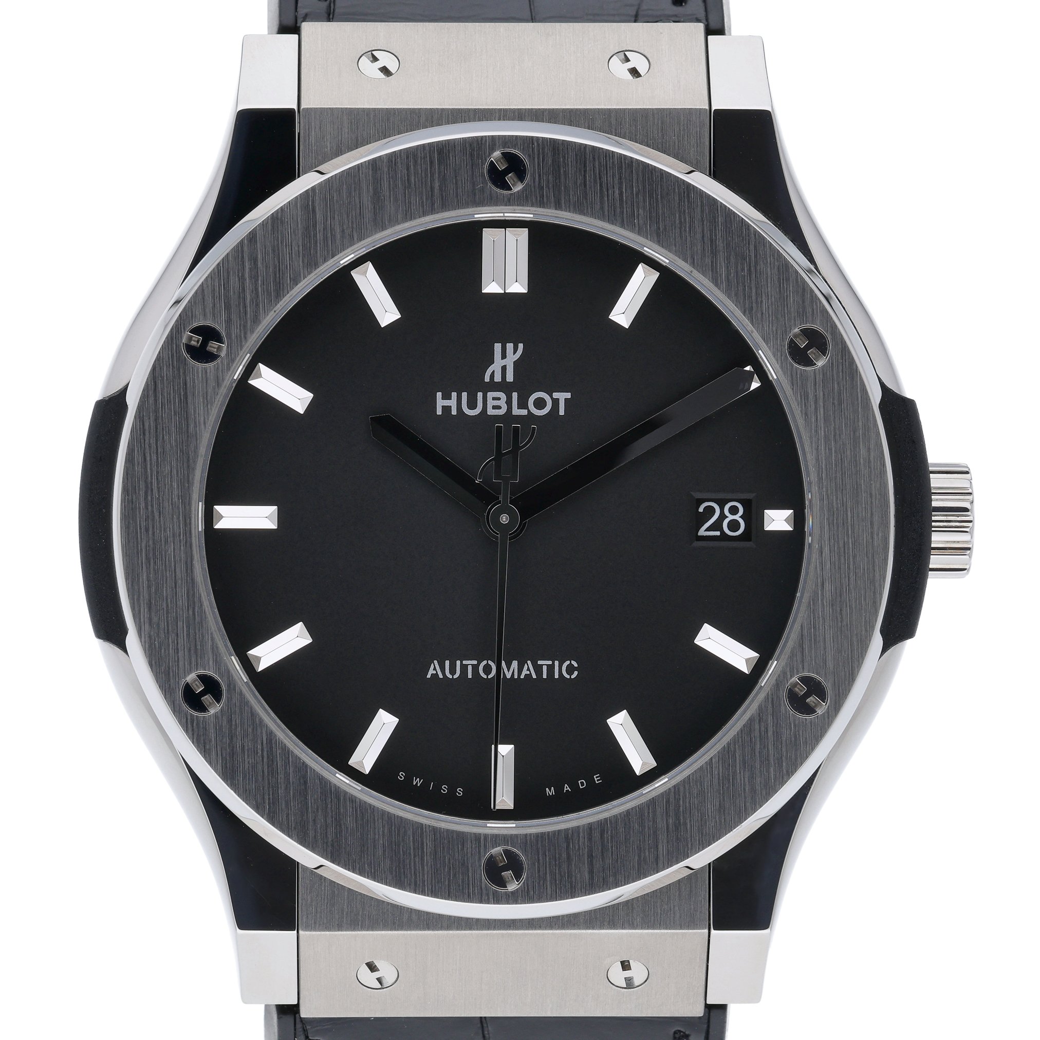 This Hublot Classic Fusion 511.NX.1171.LR has a black baton dial and a rubber strap. This Hublot has undergone a thorough inspection of water resistance, accuracy, functionality and condition to determine the level of reconditioning required to meet our strict standards. It has also been referenced against technical documents and manufacturer records where available to ensure authenticity and a clean history. All our watches have a 24-month warranty for your peace of mind.