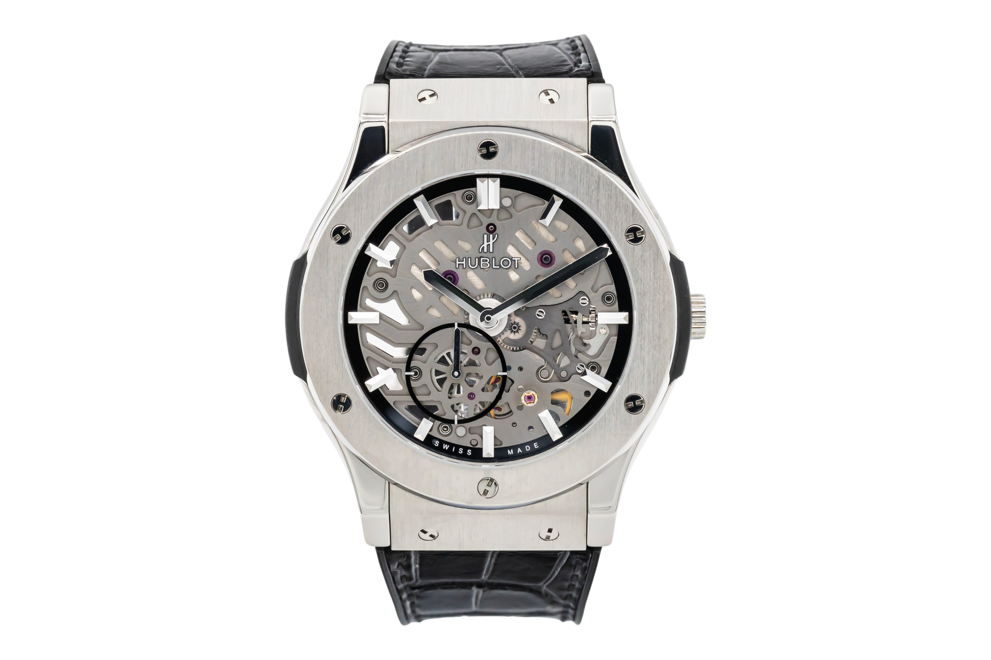 This Hublot Classic Fusion 515.NX.0170.LR has a skeleton dial and a leather strap. This Hublot has undergone a thorough inspection of water resistance, accuracy, functionality and condition to determine the level of reconditioning required to meet our strict standards. It has also been referenced against technical documents and manufacturer records where available to ensure authenticity and a clean history. All our watches have a 24-month warranty for your peace of mind.