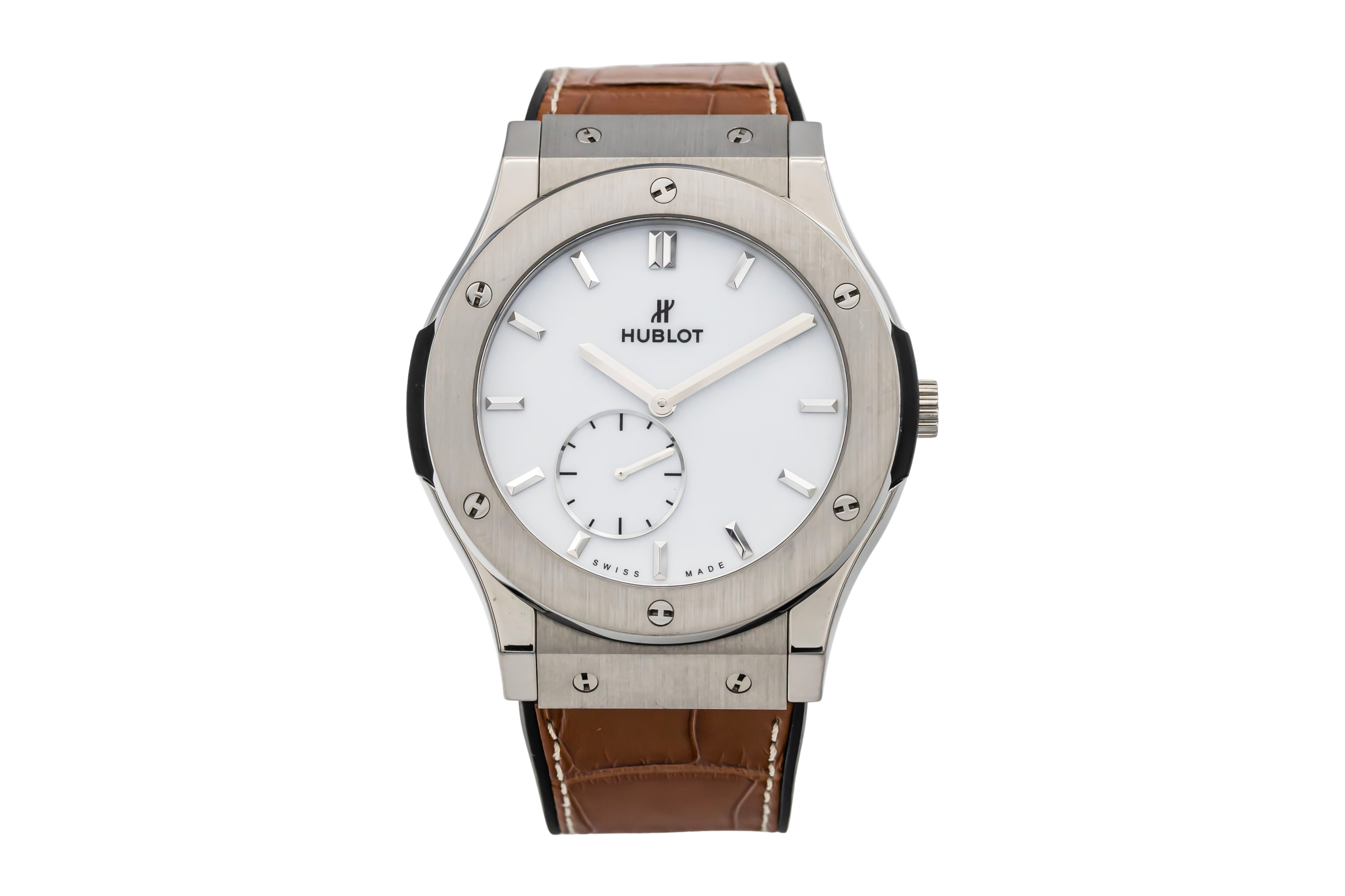 This Hublot Classic Fusion 515.NX.2210.LR has a white baton dial and a leather strap. This Hublot has undergone a thorough inspection of water resistance, accuracy, functionality and condition to determine the level of reconditioning required to meet our strict standards. It has also been referenced against technical documents and manufacturer records where available to ensure authenticity and a clean history. All our watches have a 24-month warranty for your peace of mind.