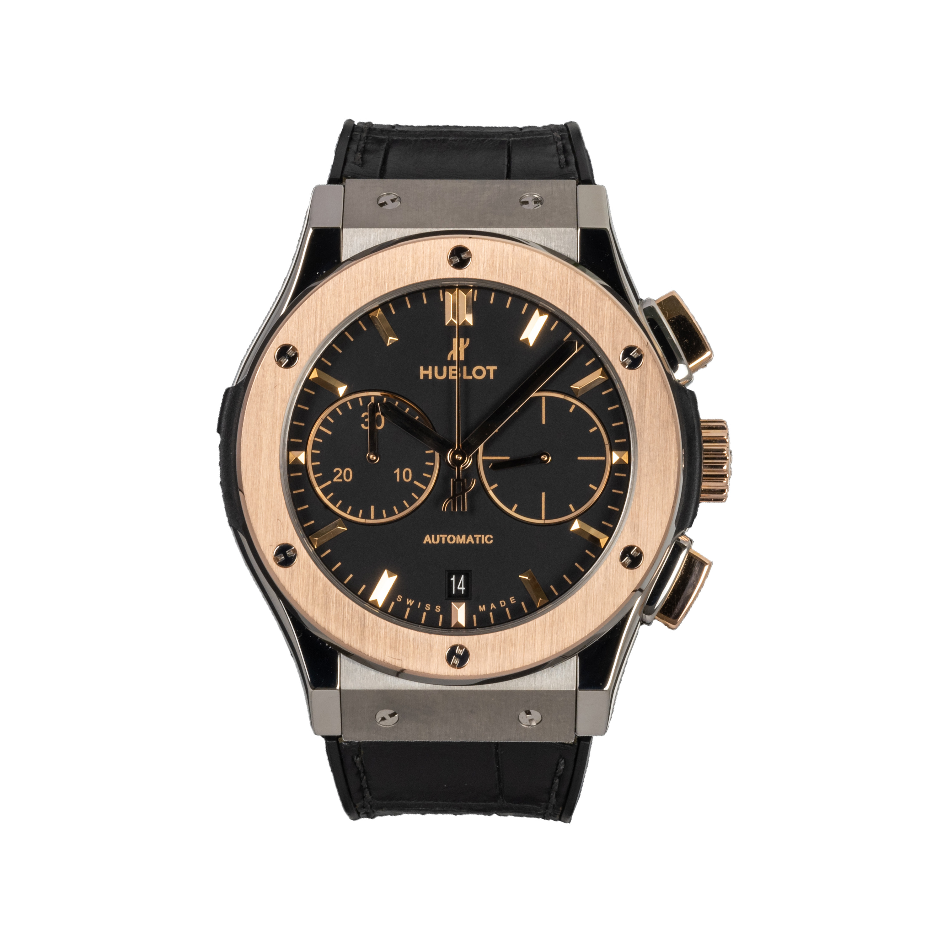 This Hublot Classic Fusion 521.NO.1181.LR has a black baton dial and a leather strap. This Hublot has undergone a thorough inspection of water resistance, accuracy, functionality and condition to determine the level of reconditioning required to meet our strict standards. It has also been referenced against technical documents and manufacturer records where available to ensure authenticity and a clean history. Our watches have a 24-month warranty for your peace of mind, in conjunction with any remaining manufacturer’s warranty from new or from service.