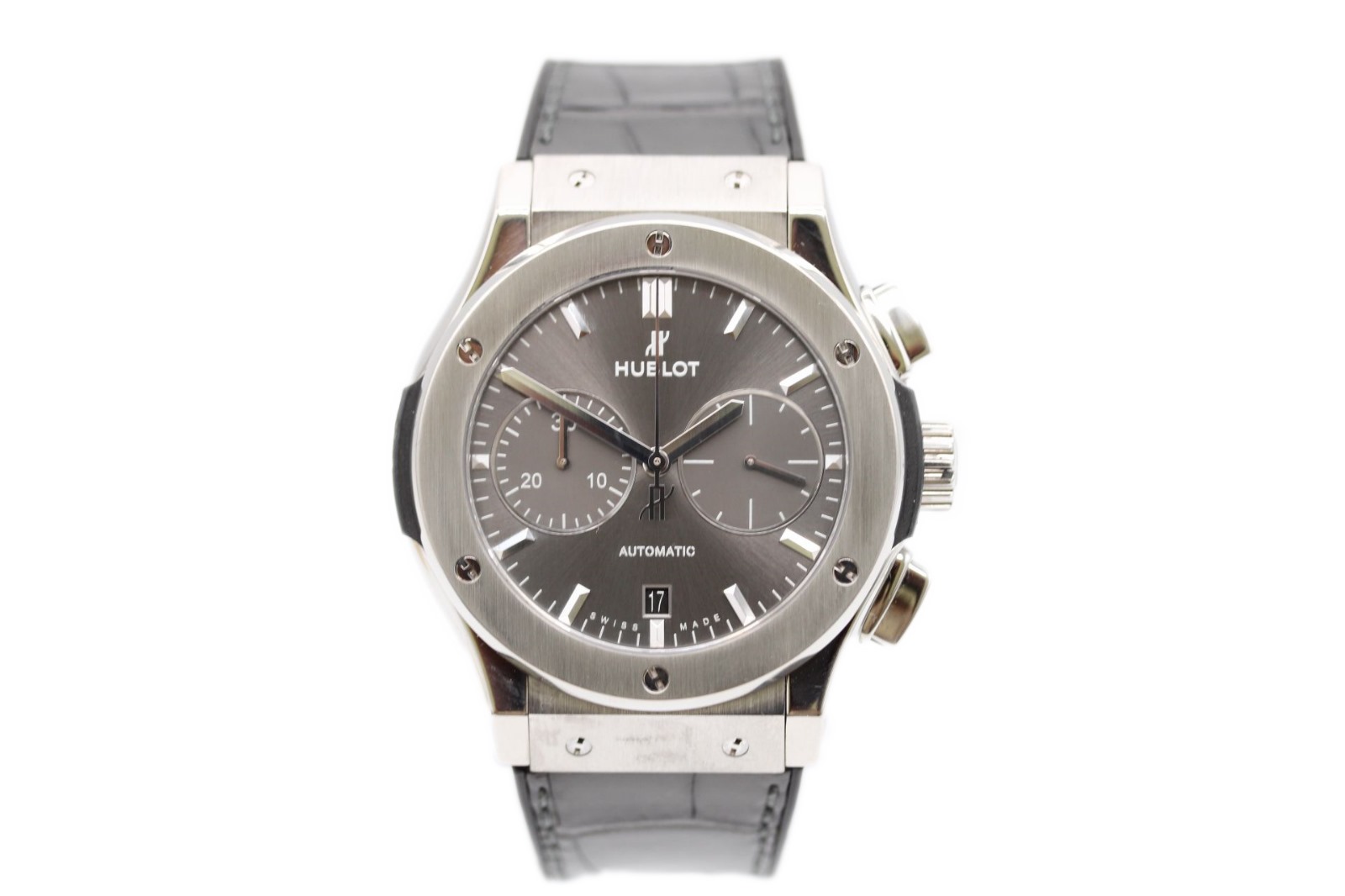 This Hublot Classic Fusion 521.NX.7071.LR has a grey baton dial and a leather strap. This Hublot has undergone a thorough inspection of water resistance, accuracy, functionality and condition to determine the level of reconditioning required to meet our strict standards. It has also been referenced against technical documents and manufacturer records where available to ensure authenticity and a clean history. All our watches have a 24-month warranty for your peace of mind.