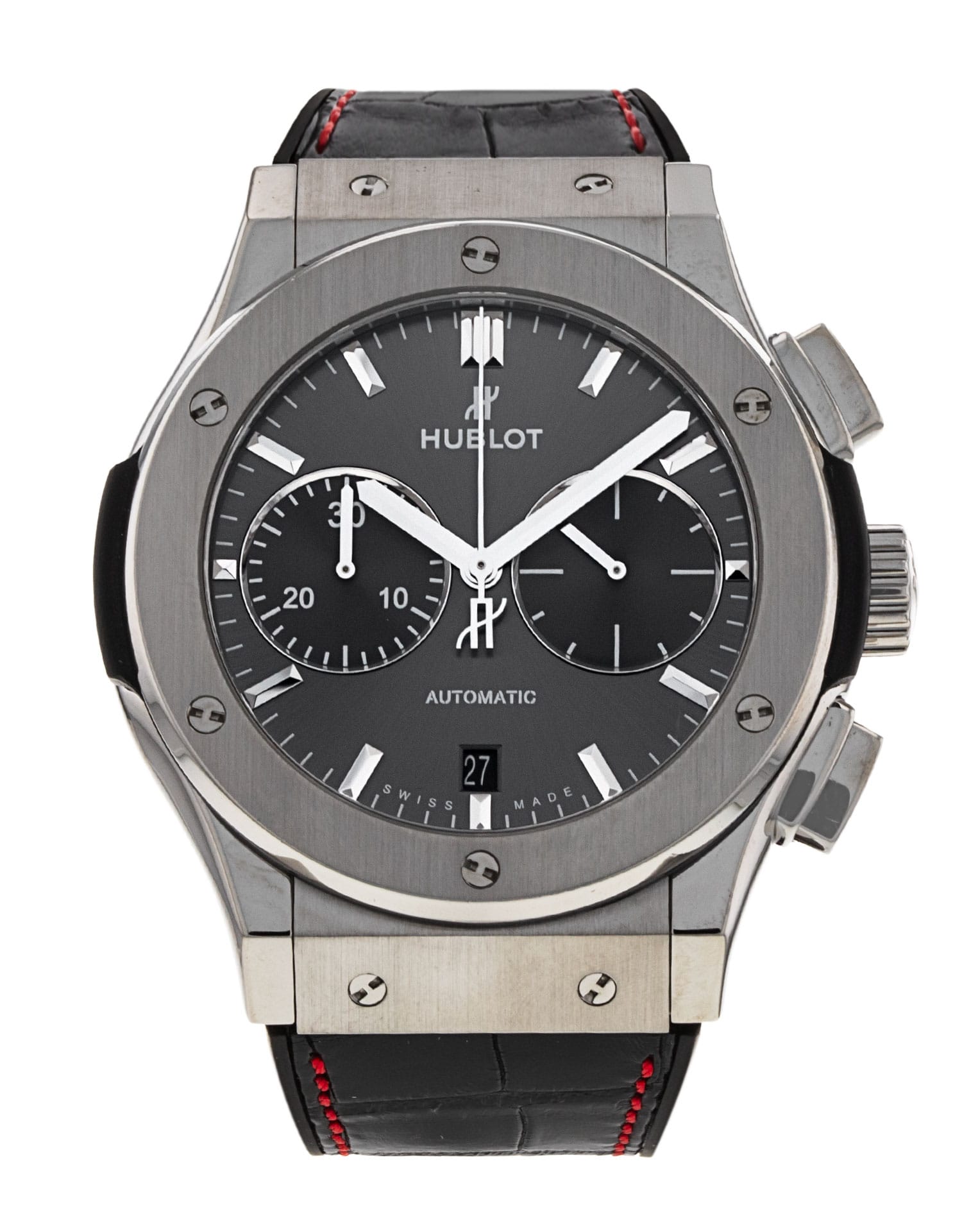 This Hublot Classic Fusion 521.NX.7071.LR has a grey baton dial and a leather strap. This Hublot has undergone a thorough inspection of water resistance, accuracy, functionality and condition to determine the level of reconditioning required to meet our strict standards. It has also been referenced against technical documents and manufacturer records where available to ensure authenticity and a clean history. All our watches have a 24-month warranty for your peace of mind.
