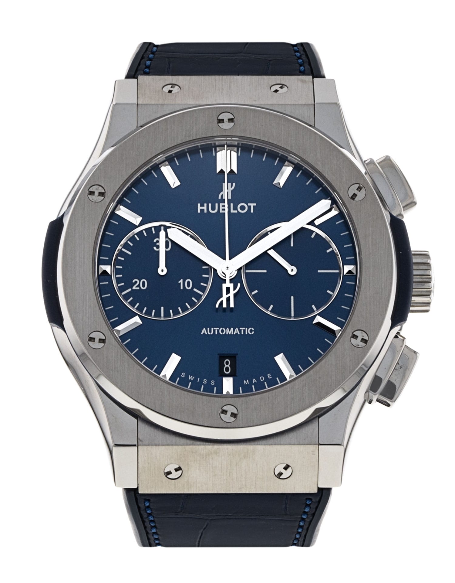 This Hublot Classic Fusion 521.NX.7170.LR has a blue baton dial and a leather strap. This Hublot has undergone a thorough inspection of water resistance, accuracy, functionality and condition to determine the level of reconditioning required to meet our strict standards. It has also been referenced against technical documents and manufacturer records where available to ensure authenticity and a clean history. All our watches have a 24-month warranty for your peace of mind.