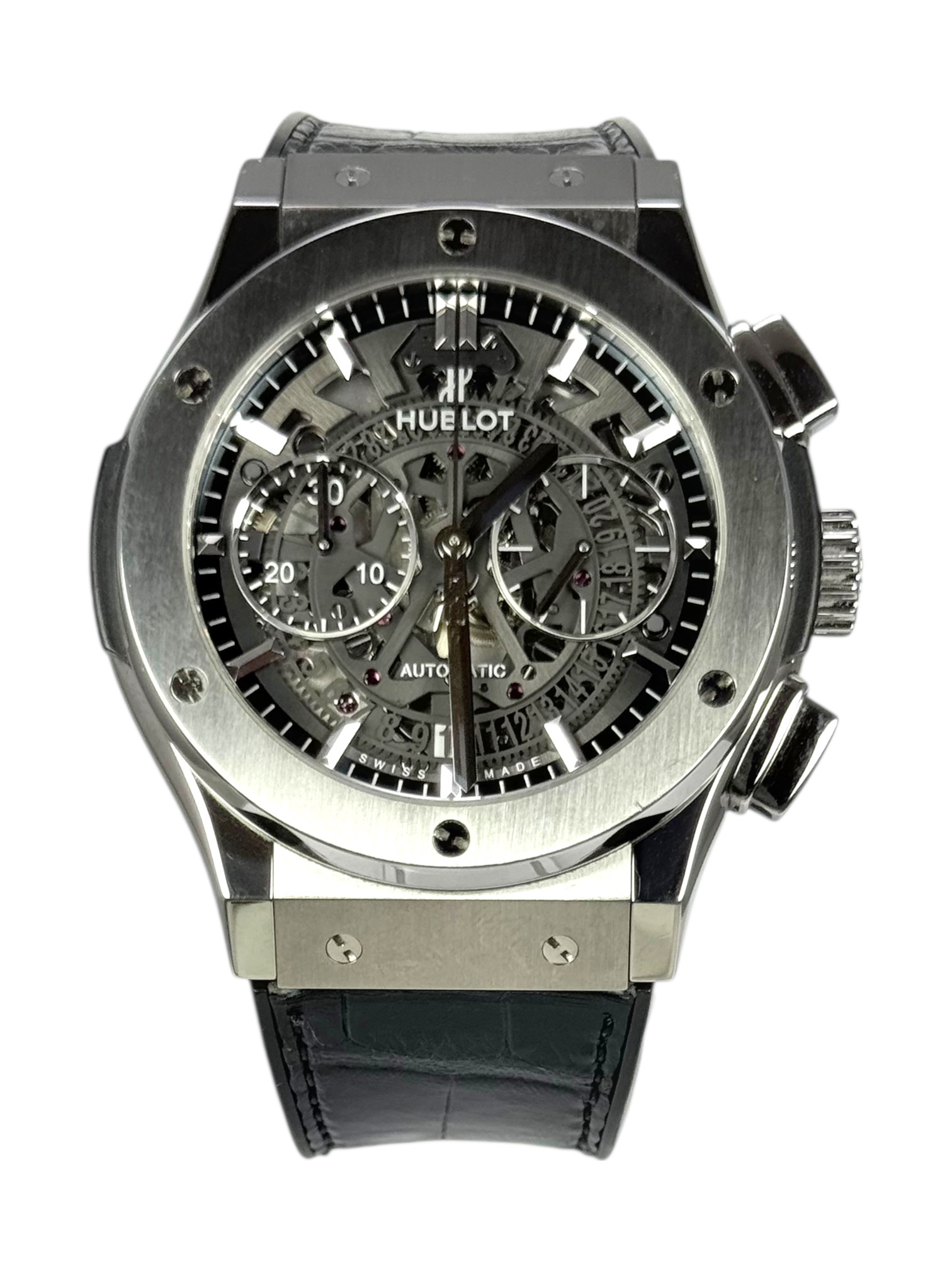 This Hublot Classic Fusion 525.NX.0170.LR has a skeleton dial and a rubber strap. This Hublot has undergone a thorough inspection of water resistance, accuracy, functionality and condition to determine the level of reconditioning required to meet our strict standards. It has also been referenced against technical documents and manufacturer records where available to ensure authenticity and a clean history. All our watches have a 24-month warranty for your peace of mind.