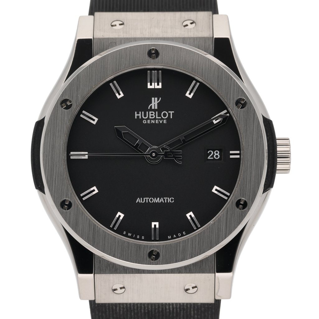 This Hublot Classic Fusion 542.NX.1170.RX has a black baton dial and a rubber strap. This Hublot has undergone a thorough inspection of water resistance, accuracy, functionality and condition to determine the level of reconditioning required to meet our strict standards. It has also been referenced against technical documents and manufacturer records where available to ensure authenticity and a clean history. All our watches have a 24-month warranty for your peace of mind.