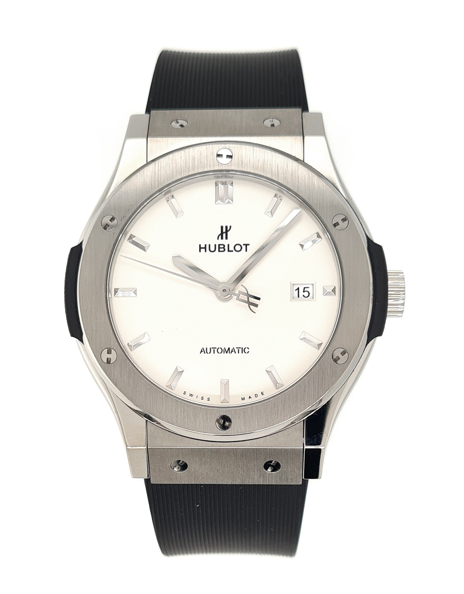 This Hublot Classic Fusion 542.NX.2611.LR has a silver baton dial and a rubber strap. This Hublot has undergone a thorough inspection of water resistance, accuracy, functionality and condition to determine the level of reconditioning required to meet our strict standards. It has also been referenced against technical documents and manufacturer records where available to ensure authenticity and a clean history. All our watches have a 24-month warranty for your peace of mind.