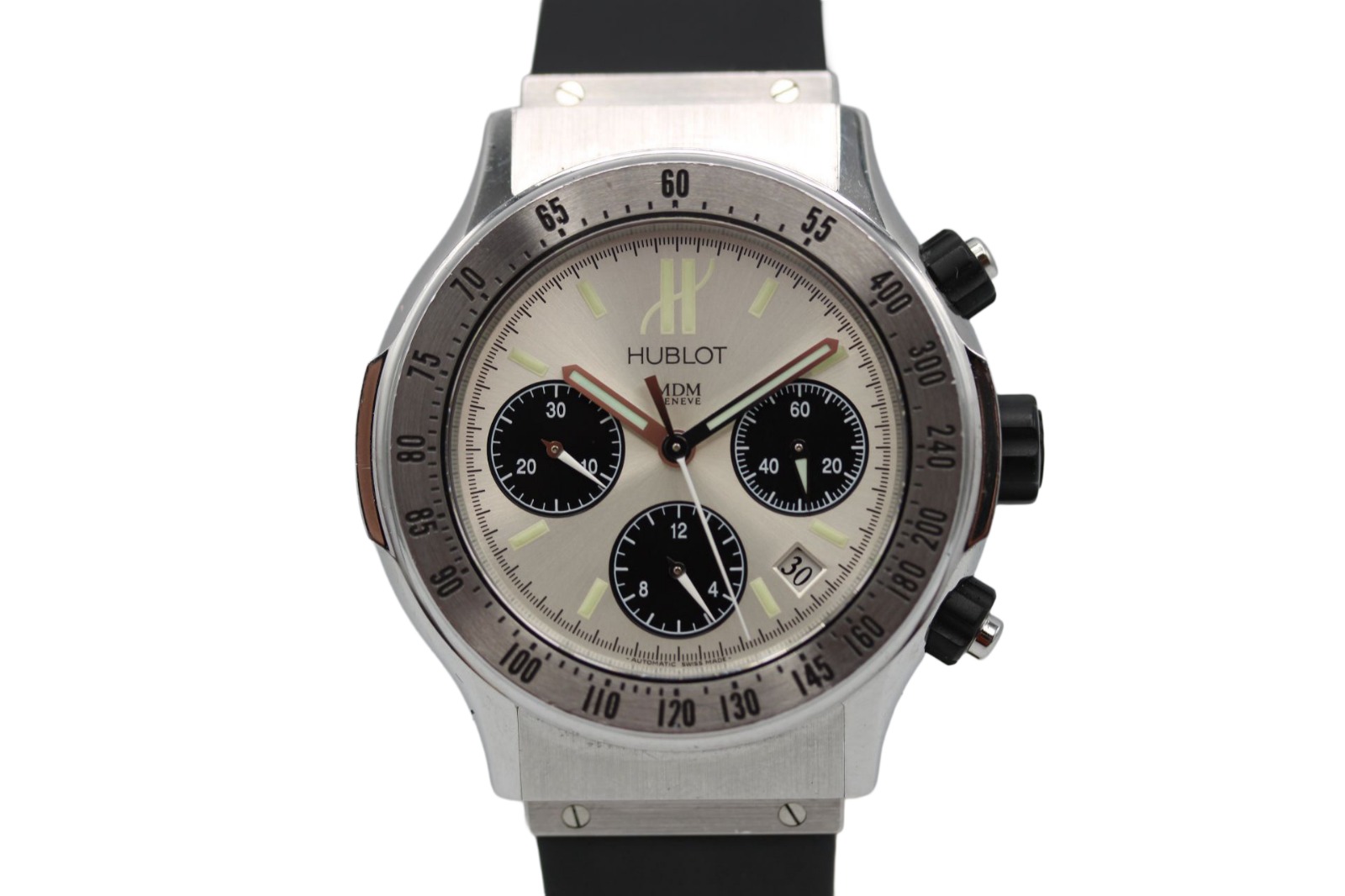 This Hublot SuperB Chronograph Sport 1920.1 has a black baton dial and a rubber strap. This Hublot has undergone a thorough inspection of water resistance, accuracy, functionality and condition to determine the level of reconditioning required to meet our strict standards. It has also been referenced against technical documents and manufacturer records where available to ensure authenticity and a clean history. All our watches have a 24-month warranty for your peace of mind.