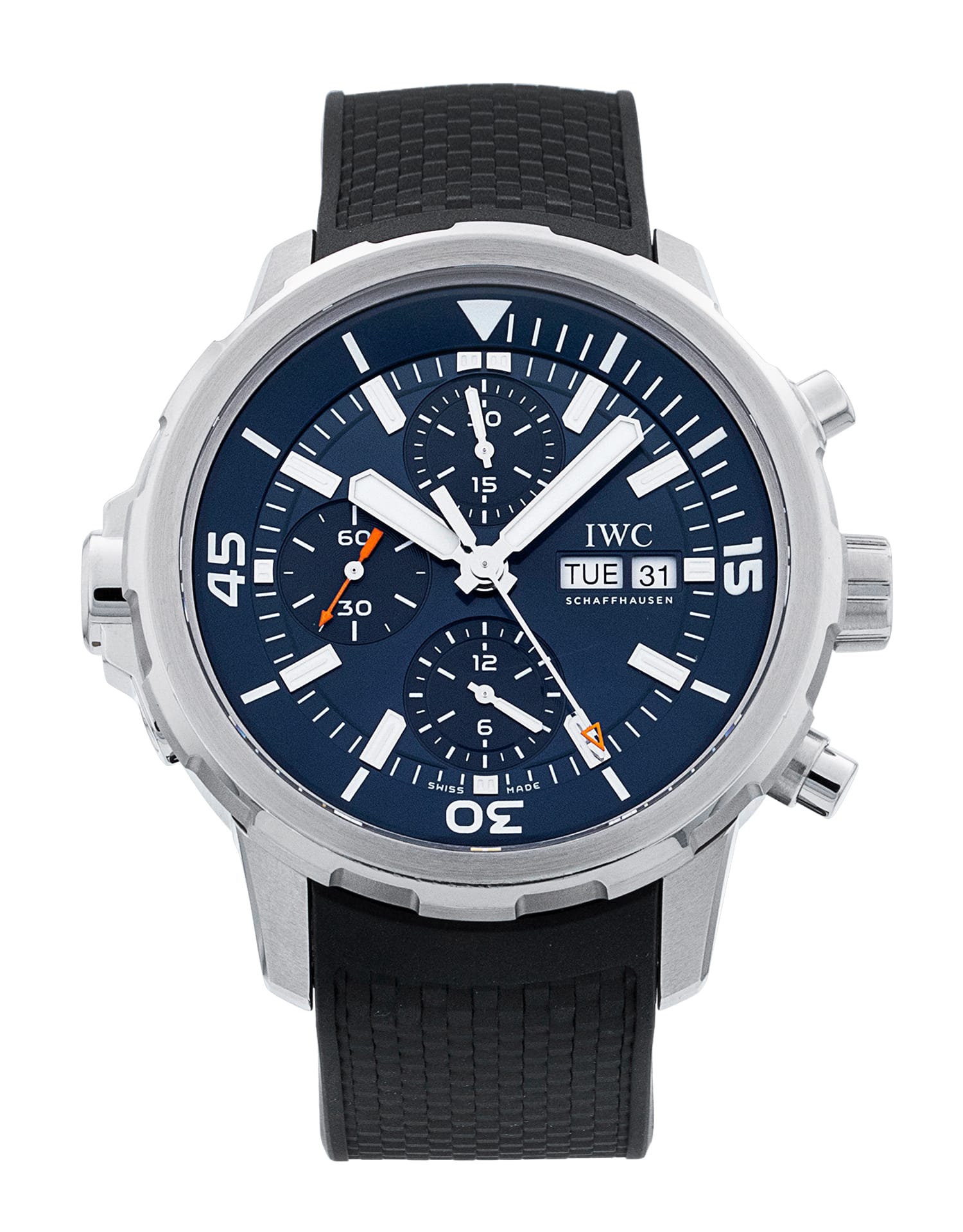 This is a special edition “Expedition Jacques-Yves Cousteau”. In all respects, it is identical to the regular Aquatimer Chronograph – waterproof to 30 bar, equipped with SafeDive bezel that prevents accidental changes to dive times, and don't forget the slick calibre 79320 inside. The chronograph function handles single stop times and aggregate timing up to 12 hours. The key differences in this edition are the blue dial and the engraving on the back, which depicts legendary diver and documentarian Jacques-Yves Cousteau. Cousteau was also a committed environmentalist, and his charity, the Cousteau Society, which protects marine ecosystems, is a direct beneficiary of proceeds from this special edition.