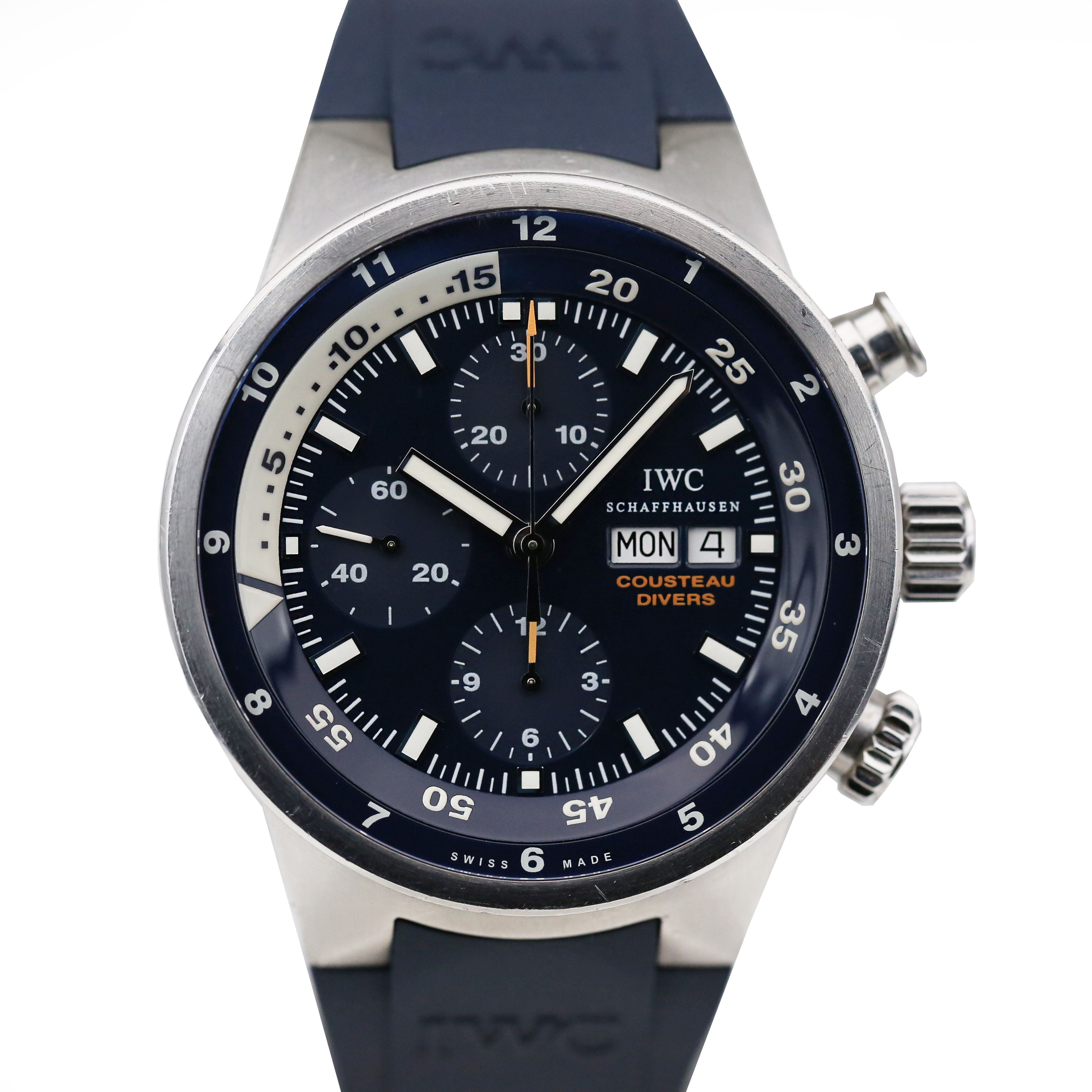 This IWC Aquatimer IW378201 has a blue baton dial and a rubber strap. This IWC has undergone a thorough inspection of accuracy, functionality and condition at our IWC certified service centre to determine the level of reconditioning required to meet our strict standards. It has also been checked against our records to ensure authenticity. All our watches have a 24-month warranty for your peace of mind.