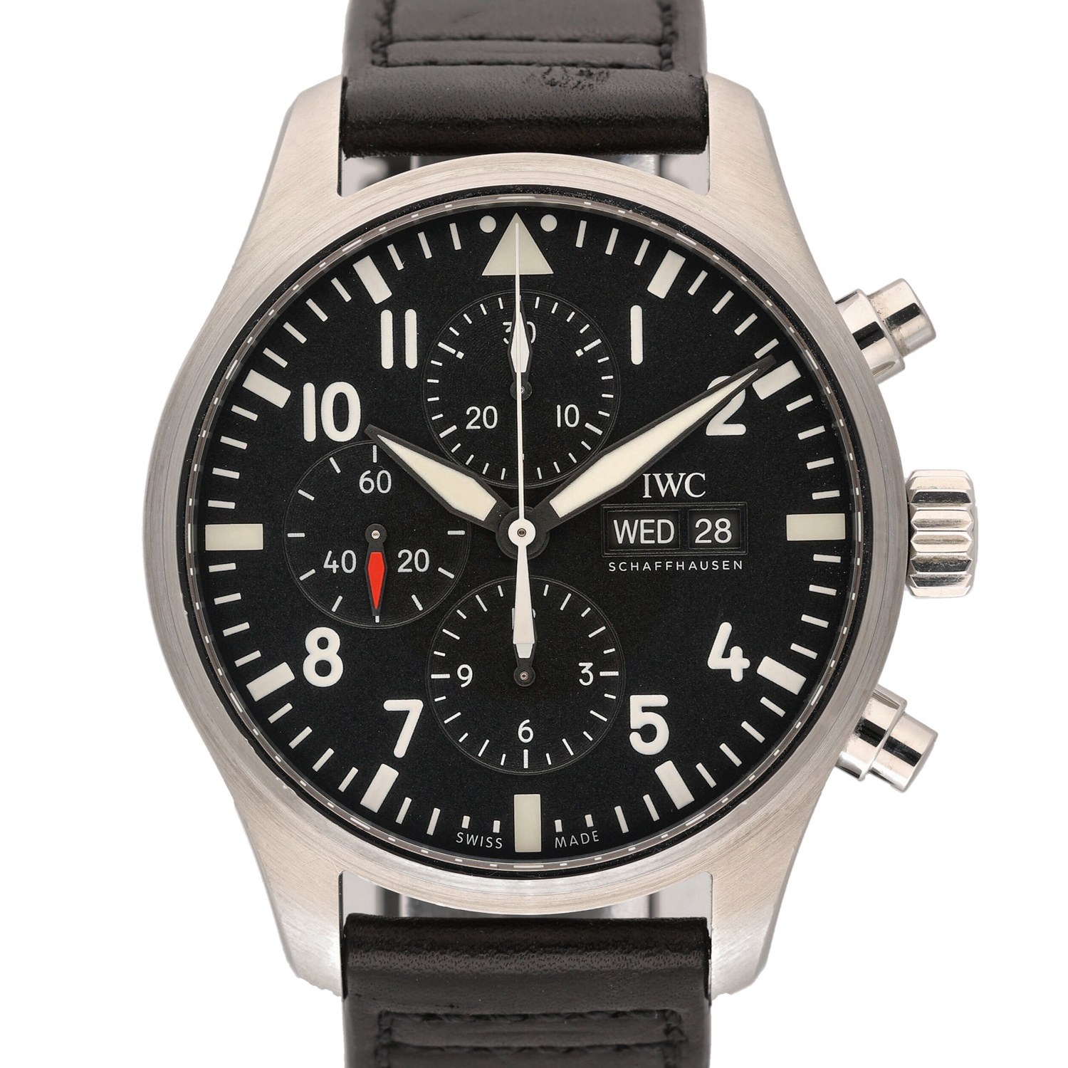 This IWC Pilot's Chrono IW377709 has a black arabic dial and a leather strap. This IWC has undergone a thorough inspection of accuracy, functionality and condition at our IWC certified service centre to determine the level of reconditioning required to meet our strict standards. It has also been checked against our records to ensure authenticity. All our watches have a 24-month warranty for your peace of mind.