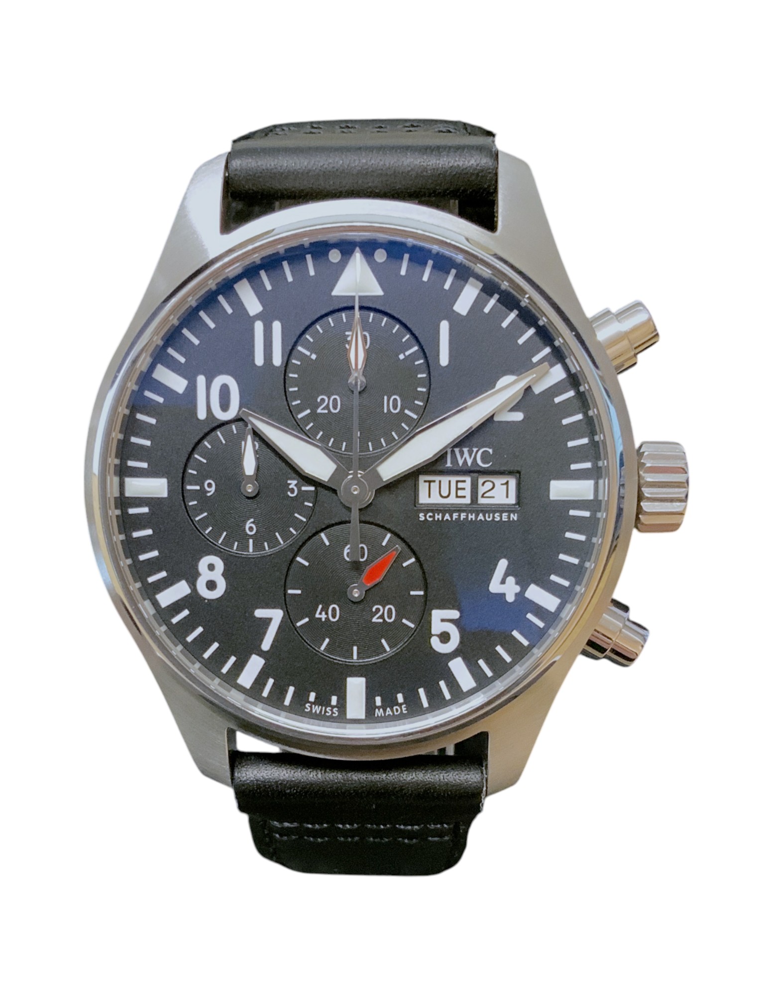 This IWC Pilot's Chrono IW378001 has a black arabic dial and a leather strap. This IWC has undergone a thorough inspection of accuracy, functionality and condition at our IWC certified service centre to determine the level of reconditioning required to meet our strict standards. It has also been checked against our records to ensure authenticity. Our watches have a 24-month warranty for your peace of mind, in conjunction with any remaining manufacturer’s warranty from new or from service.
