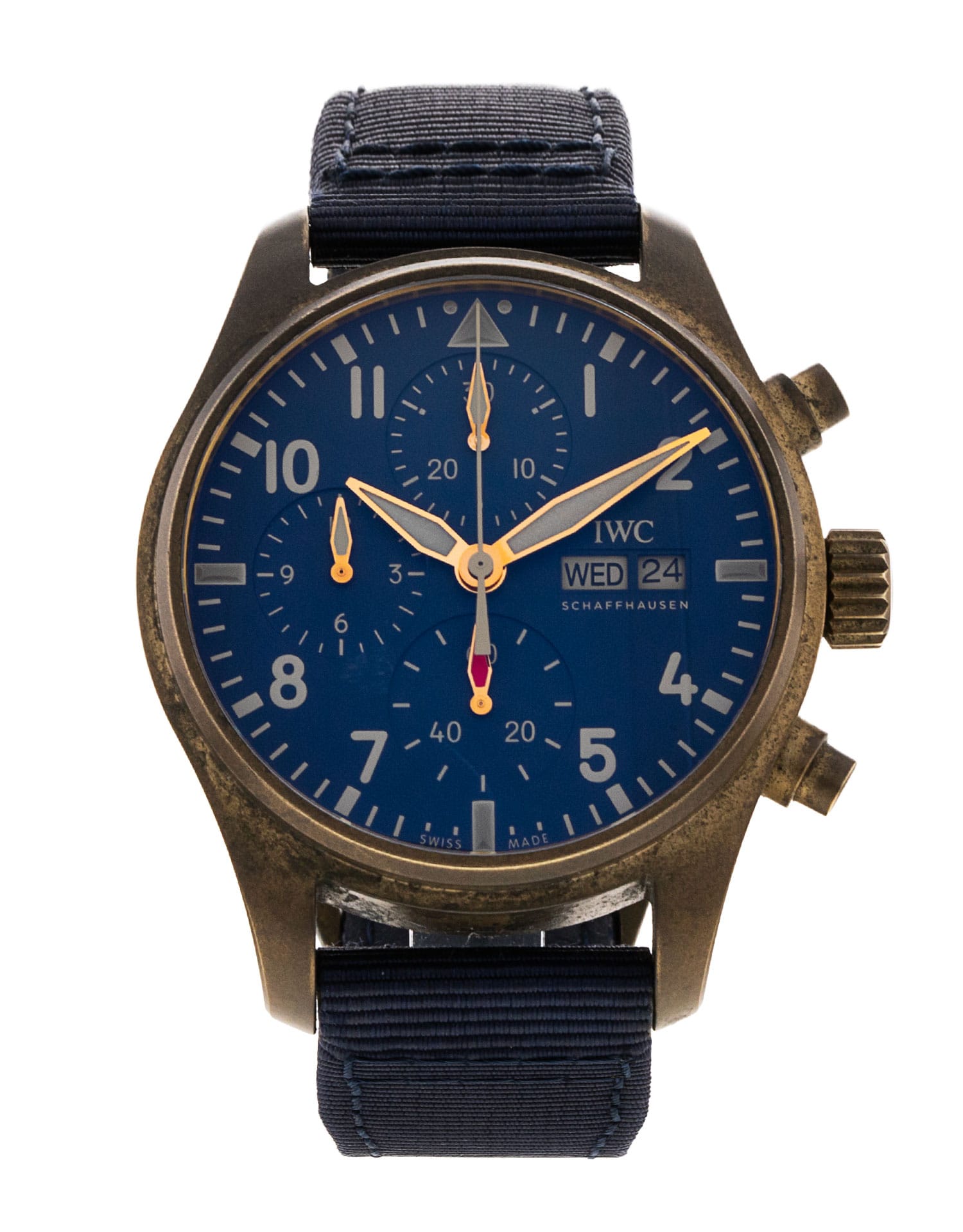 This IWC Pilot's Chrono IW388109 has a blue arabic dial and a fabric strap. This IWC has undergone a thorough inspection of accuracy, functionality and condition at our IWC certified service centre to determine the level of reconditioning required to meet our strict standards. It has also been checked against our records to ensure authenticity. All our watches have a 24-month warranty for your peace of mind.