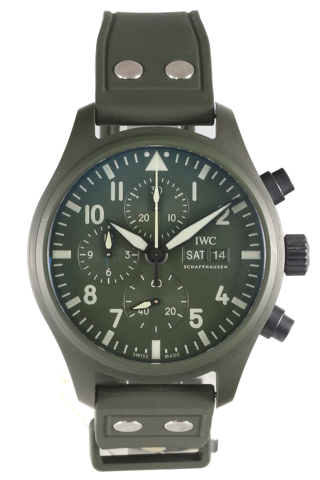 This IWC Pilot's Chrono IW389106 has a green arabic dial and a rubber strap. This IWC has undergone a thorough inspection of accuracy, functionality and condition at our IWC certified service centre to determine the level of reconditioning required to meet our strict standards. It has also been checked against our records to ensure authenticity. Our watches have a 24-month warranty for your peace of mind, in conjunction with any remaining manufacturer’s warranty from new or from service.