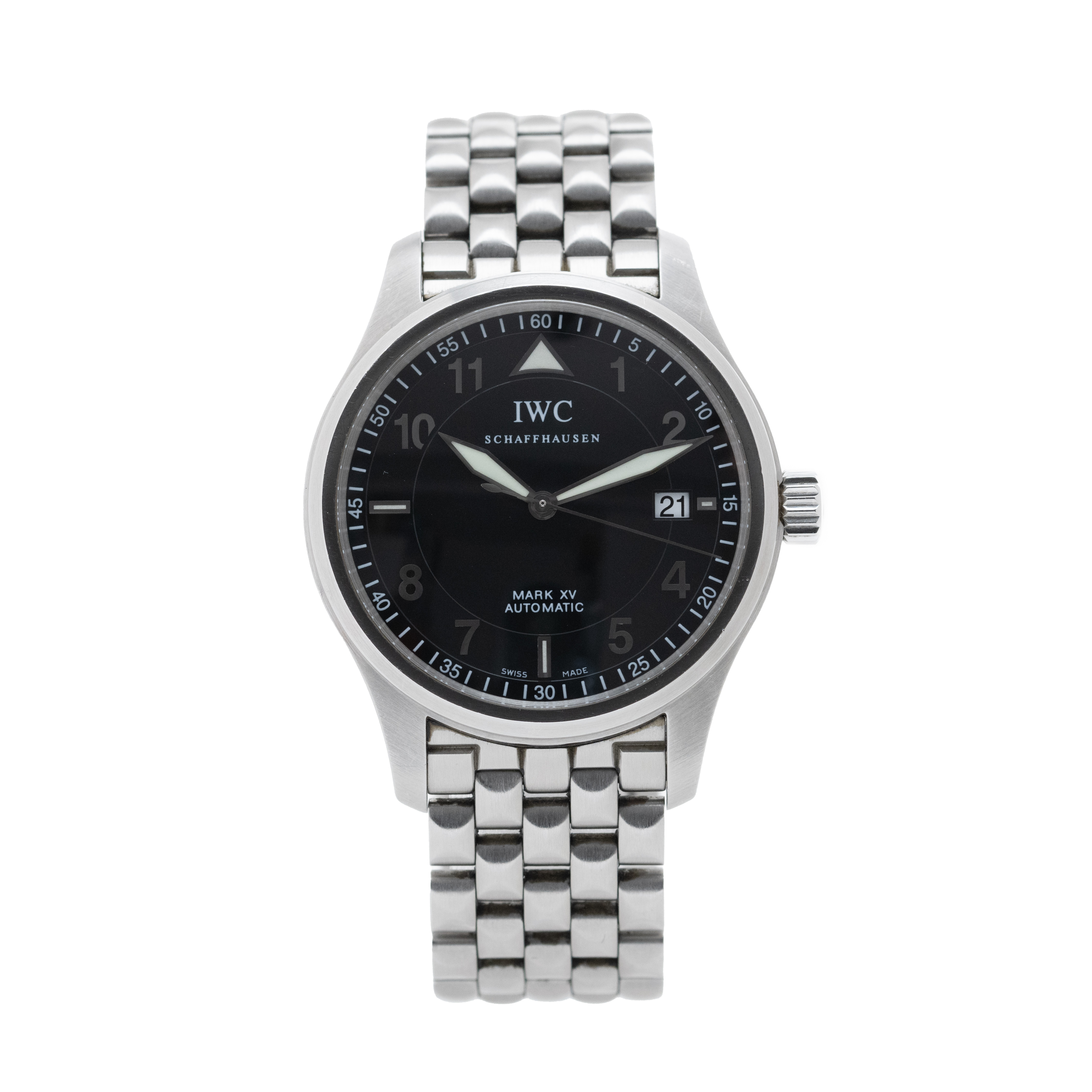 This IWC Pilot's Mark XV IW325312 has a black arabic dial and a bracelet strap. This IWC has undergone a thorough inspection of accuracy, functionality and condition at our IWC certified service centre to determine the level of reconditioning required to meet our strict standards. It has also been checked against our records to ensure authenticity. All our watches have a 24-month warranty for your peace of mind.
