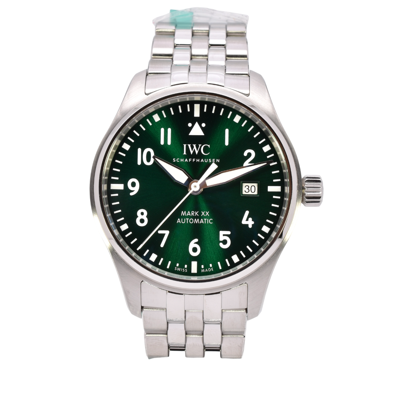 This IWC Pilot's Mark XX IW328206 has a green arabic dial and a bracelet strap. This IWC has undergone a thorough inspection of accuracy, functionality and condition at our IWC certified service centre to determine the level of reconditioning required to meet our strict standards. It has also been checked against our records to ensure authenticity. Our watches have a 24-month warranty for your peace of mind, in conjunction with any remaining manufacturer’s warranty from new or from service.