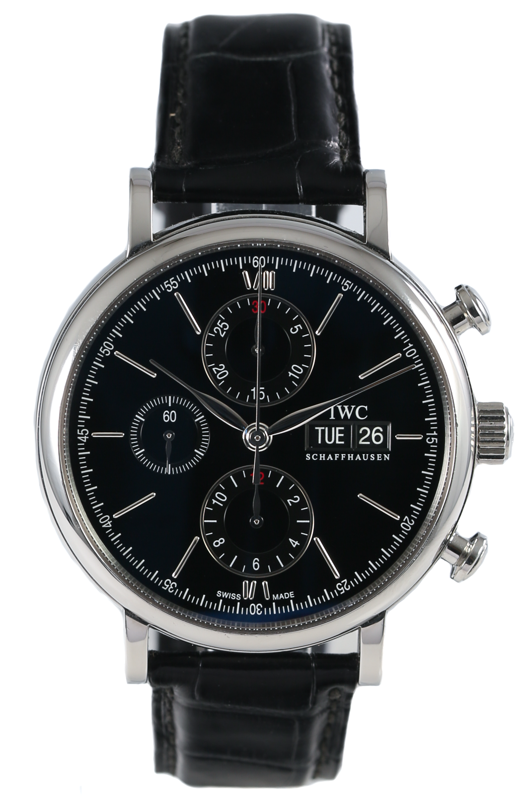 This IWC Portofino Chronograph IW391002 has a black baton dial and a leather strap. This IWC has undergone a thorough inspection of accuracy, functionality and condition at our IWC certified service centre to determine the level of reconditioning required to meet our strict standards. It has also been checked against our records to ensure authenticity. All our watches have a 24-month warranty for your peace of mind.