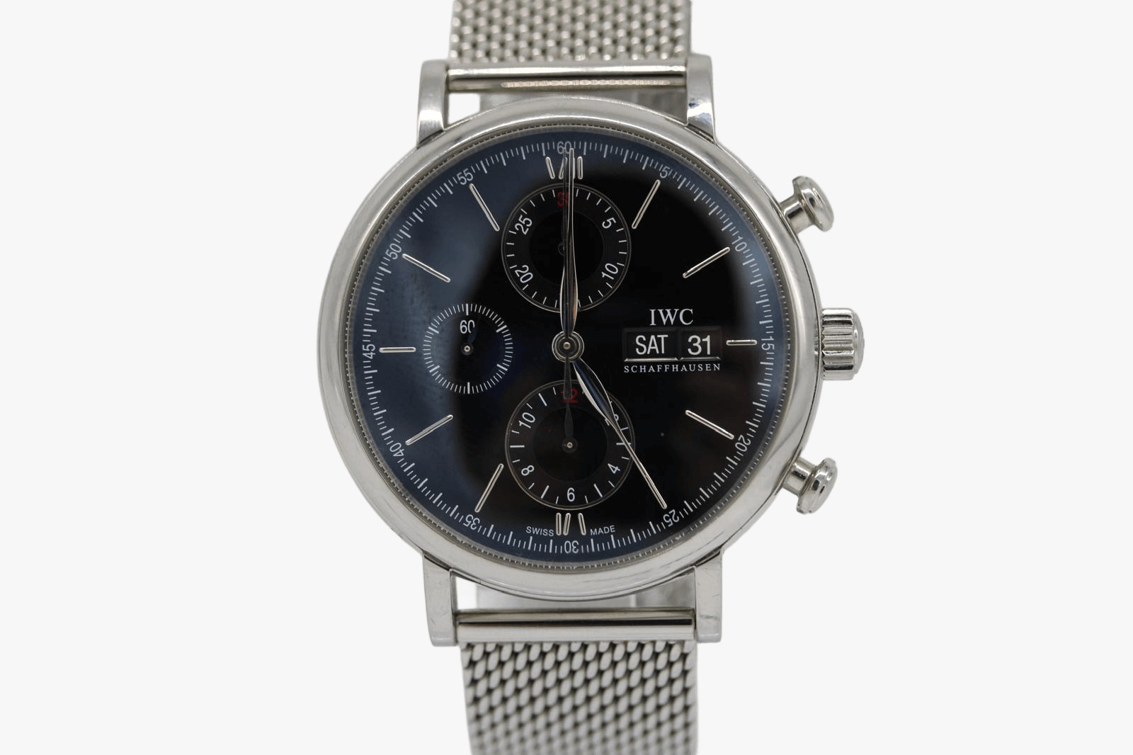 This IWC Portofino Chronograph IW391030 has a black baton dial and a bracelet strap. This IWC has undergone a thorough inspection of accuracy, functionality and condition at our IWC certified service centre to determine the level of reconditioning required to meet our strict standards. It has also been checked against our records to ensure authenticity. All our watches have a 24-month warranty for your peace of mind.
