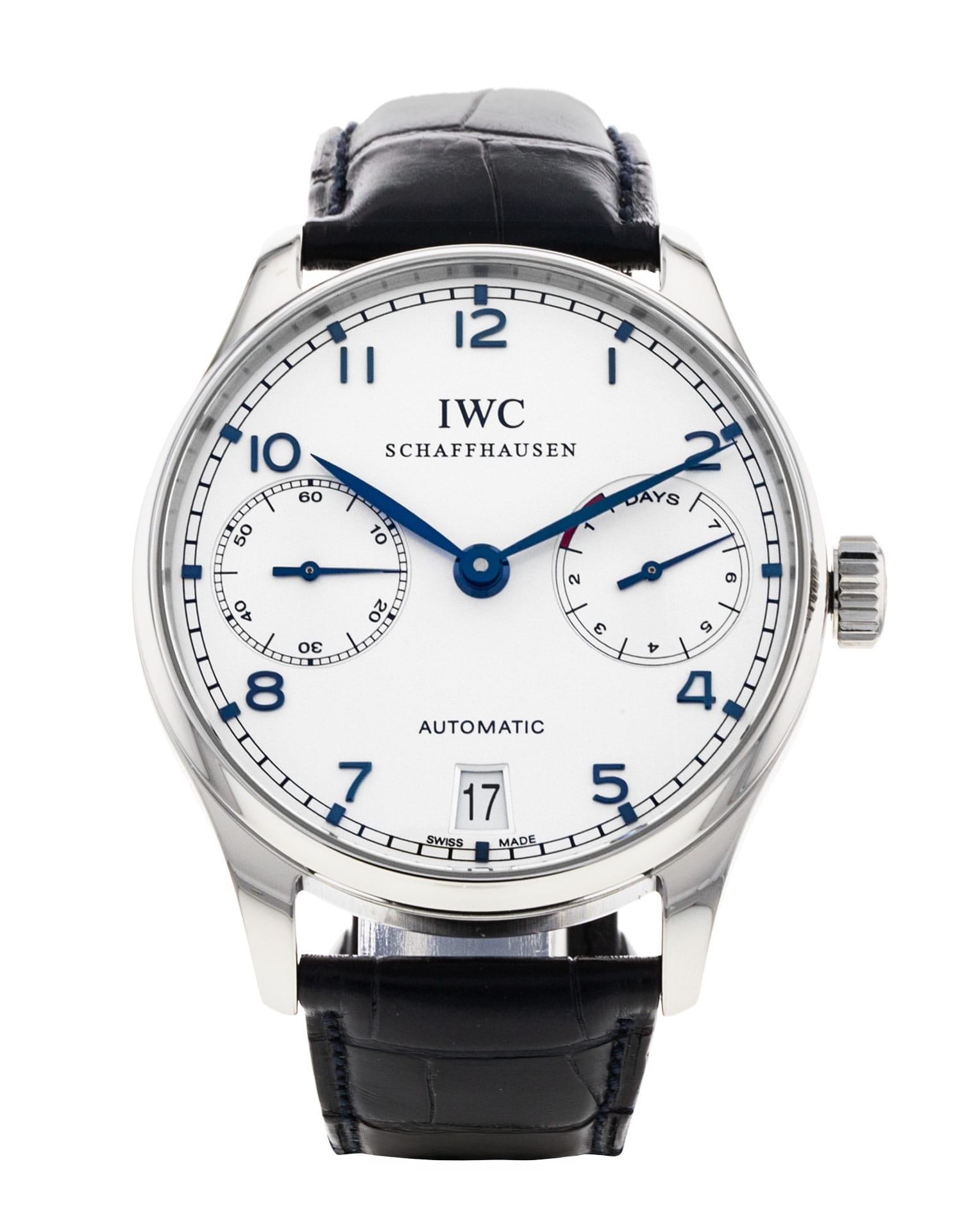 This IWC Portugieser Automatic IW500107 has a silver arabic dial and a leather strap. This IWC has undergone a thorough inspection of accuracy, functionality and condition at our IWC certified service centre to determine the level of reconditioning required to meet our strict standards. It has also been checked against our records to ensure authenticity. All our watches have a 24-month warranty for your peace of mind.