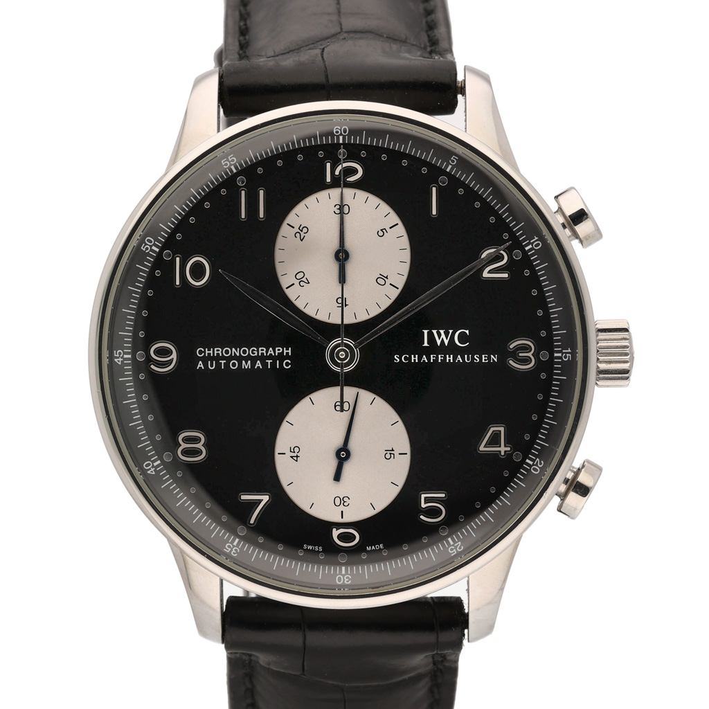 This IWC Portugieser Chrono IW371404 has a black arabic dial and a leather strap. This IWC has undergone a thorough inspection of accuracy, functionality and condition at our IWC certified service centre to determine the level of reconditioning required to meet our strict standards. It has also been checked against our records to ensure authenticity. All our watches have a 24-month warranty for your peace of mind.