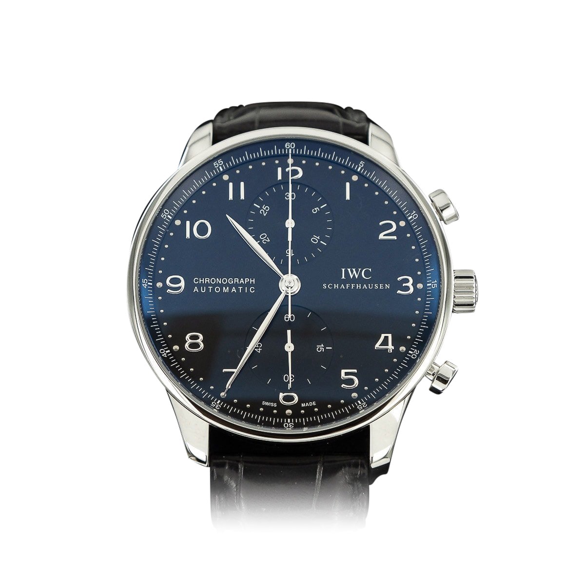 This IWC Portugieser Chrono IW371447 has a black arabic dial and a leather strap. This IWC has undergone a thorough inspection of accuracy, functionality and condition at our IWC certified service centre to determine the level of reconditioning required to meet our strict standards. It has also been checked against our records to ensure authenticity. All our watches have a 24-month warranty for your peace of mind.