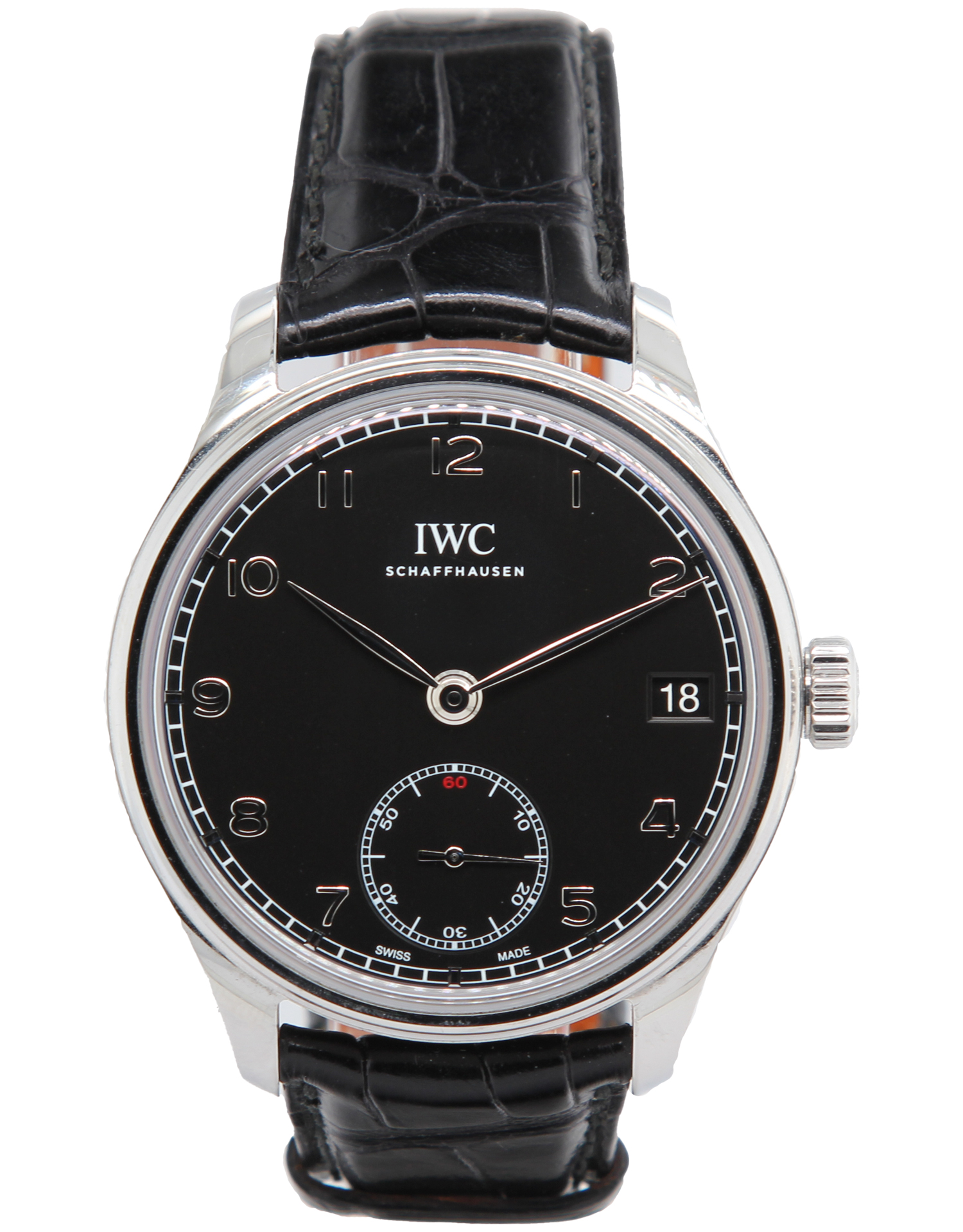 This IWC Portugieser Hand-Wound IW510202 has a black arabic dial and a leather strap. This IWC has undergone a thorough inspection of accuracy, functionality and condition at our IWC certified service centre to determine the level of reconditioning required to meet our strict standards. It has also been checked against our records to ensure authenticity. All our watches have a 24-month warranty for your peace of mind.