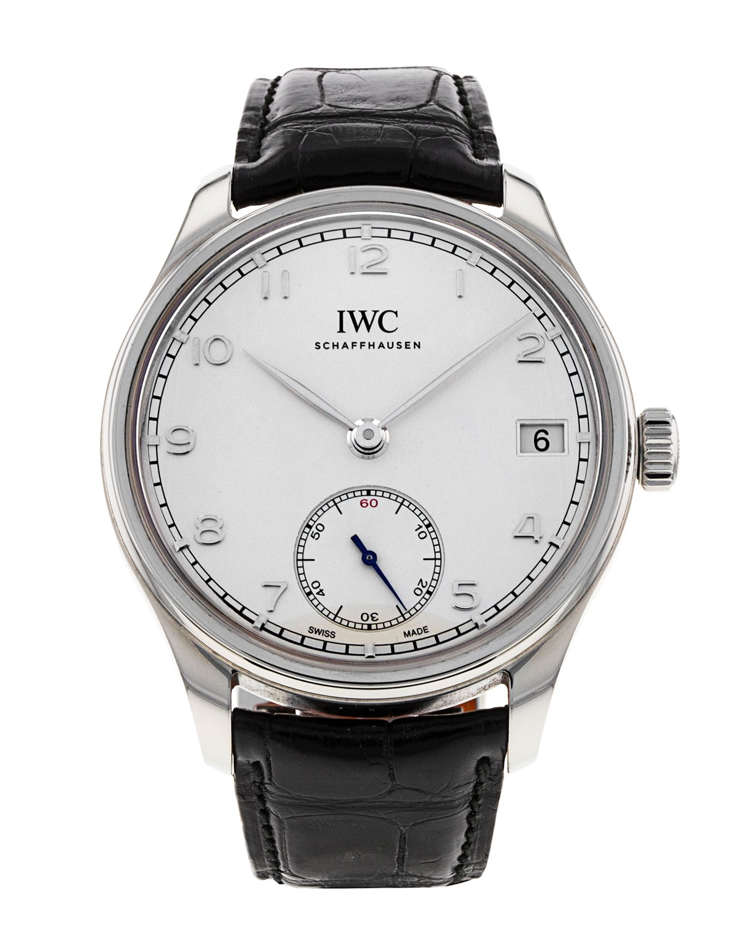 This IWC Portugieser Hand-Wound IW510203 has a silver arabic dial and a leather strap. This IWC has undergone a thorough inspection of accuracy, functionality and condition at our IWC certified service centre to determine the level of reconditioning required to meet our strict standards. It has also been checked against our records to ensure authenticity. All our watches have a 24-month warranty for your peace of mind.