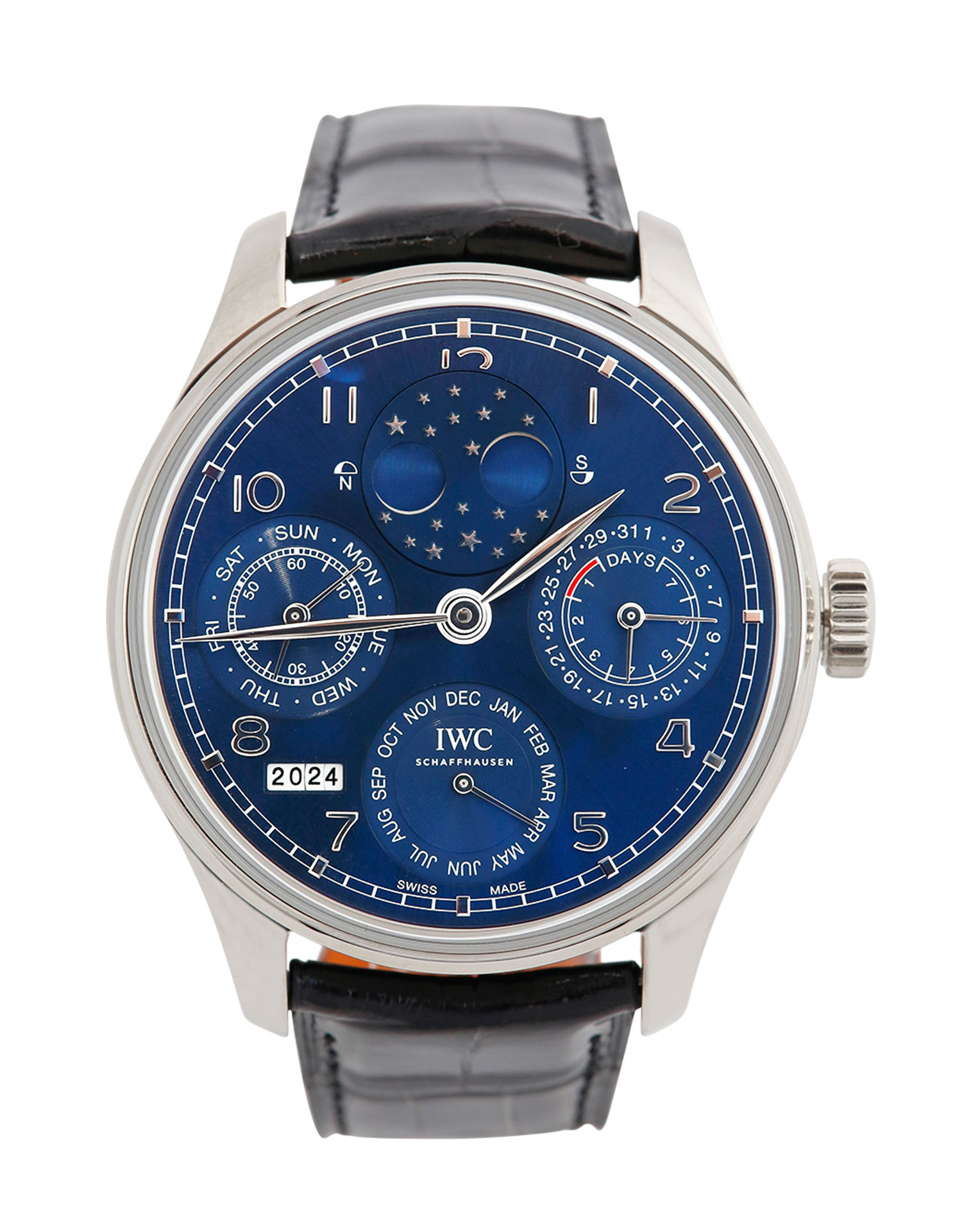 This IWC Portugieser Perpetual Calendar IW503401 has a blue arabic dial and a leather strap. This IWC has undergone a thorough inspection of accuracy, functionality and condition at our IWC certified service centre to determine the level of reconditioning required to meet our strict standards. It has also been checked against our records to ensure authenticity. Our watches have a 24-month warranty for your peace of mind, in conjunction with any remaining manufacturer’s warranty from new or from service.