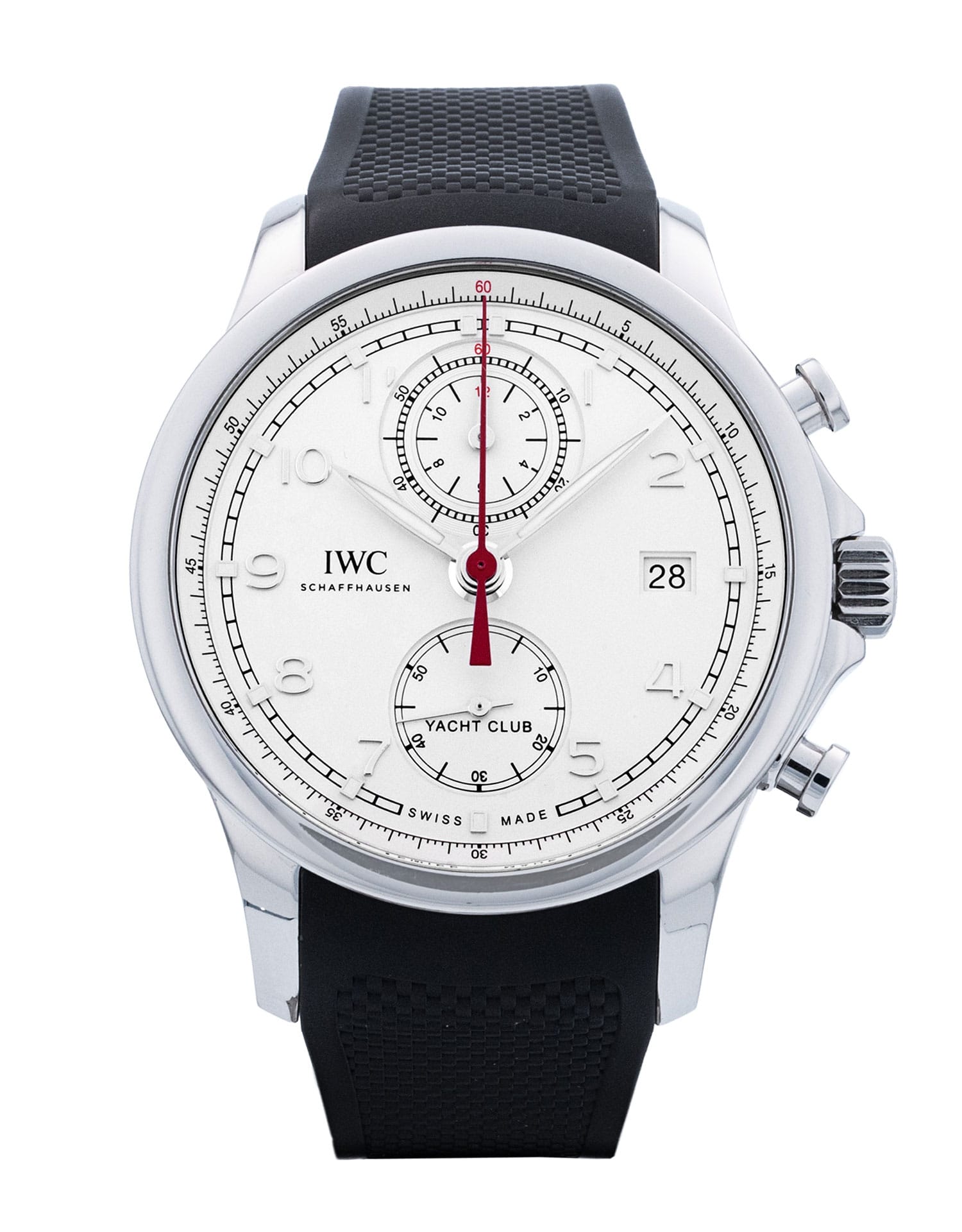 This IWC Portugieser Yacht Club IW390502 has a silver arabic dial and a rubber strap. This IWC has undergone a thorough inspection of accuracy, functionality and condition at our IWC certified service centre to determine the level of reconditioning required to meet our strict standards. It has also been checked against our records to ensure authenticity. All our watches have a 24-month warranty for your peace of mind.