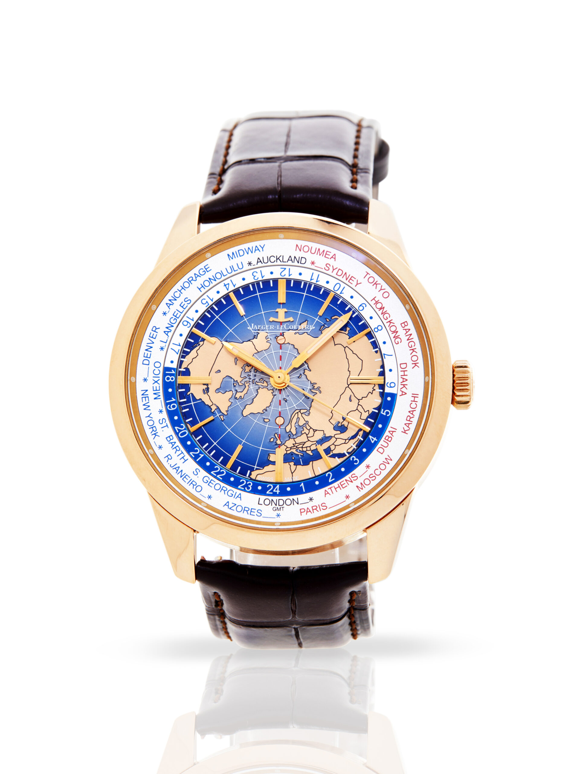 Jaeger-LeCoultre’s Geophysic line dates back to the late 1950s when the brand launched a new utilitarian model to support scientists in fields such as seismology, radioactivity, electromagnetism and glaciology. The Geophysic collection has since grown to encompass models like this beautiful Universal Time version, a 24-reference world-timer with inner-rotating ring and stunning pink gold and blue lacquered dial displaying a map of the world. Most notable, however, is its automatic Caliber 772, a jumping seconds, or true-beat, movement, which means it ticks rather sweeps in the manner of most mechanical watches. As well as providing a more precise way of keeping time, it’s a rare novelty in today’s industry, something very few brands are able to offer. This version, with an exhibition case back—permitting a view of the skeletonised rotor—comes in rose gold and is paired with an alligator strap.