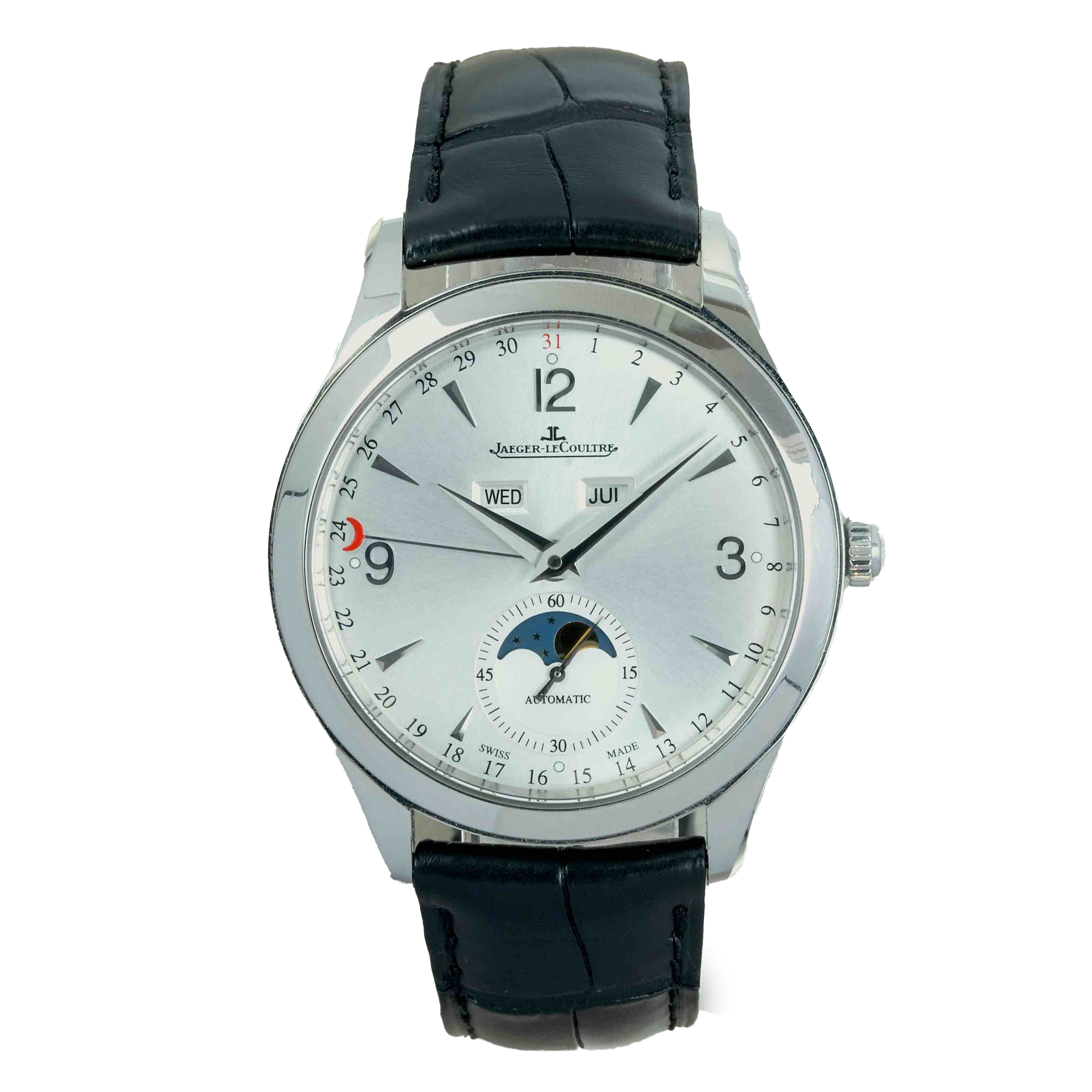 This Jaeger-LeCoultre Master Calendar 1558420 has a silver quarter arabic dial and a leather strap. This Jaeger-LeCoultre has undergone a thorough inspection of accuracy, functionality and condition at our Jaeger-LeCoultre certified service centre to determine the level of reconditioning required to meet our strict standards. It has also been checked against our records to ensure authenticity. All our watches have a 24-month warranty for your peace of mind.
