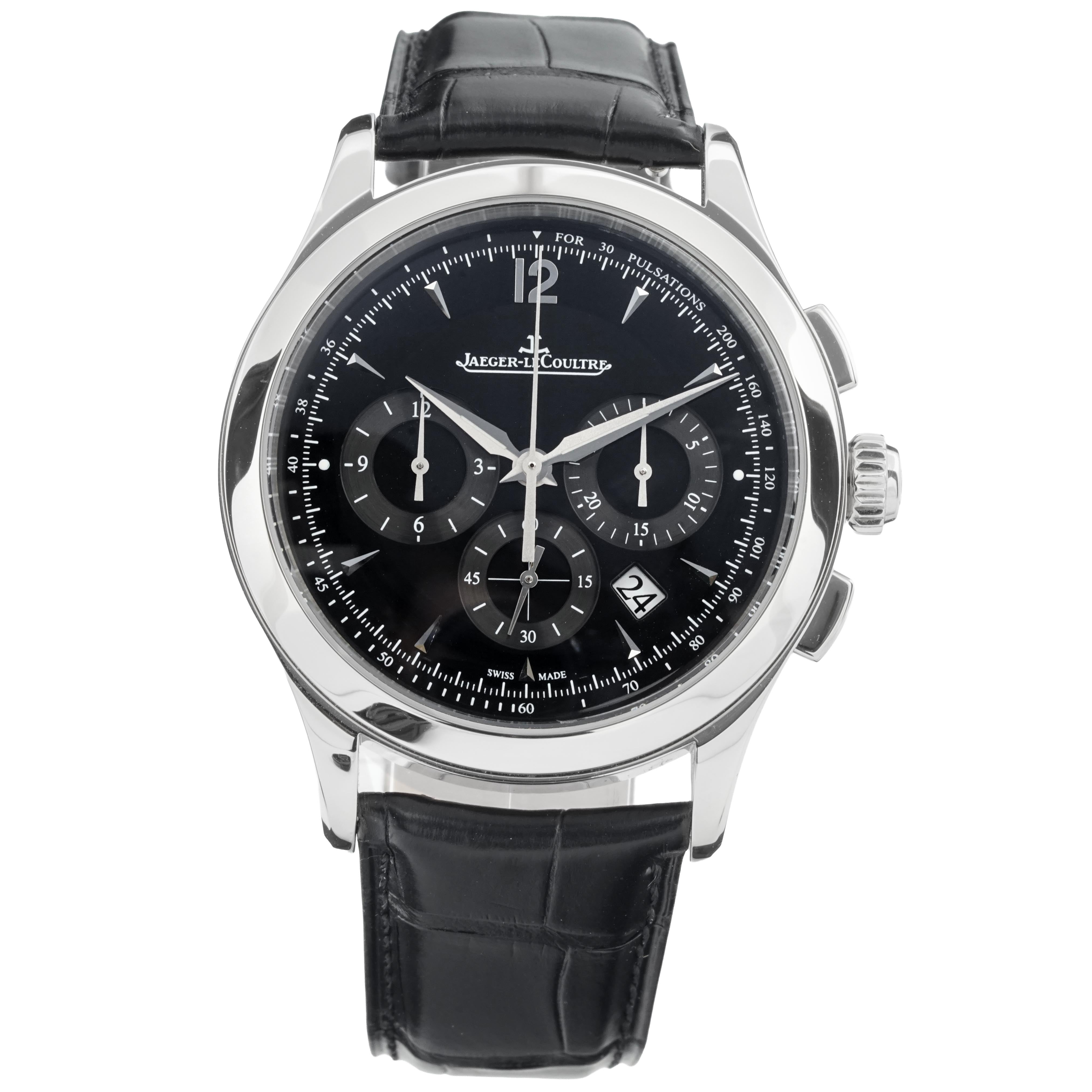This Jaeger-LeCoultre Master Chronograph 1538470 has a black dial and a leather strap. This Jaeger-LeCoultre has undergone a thorough inspection of accuracy, functionality and condition at our Jaeger-LeCoultre certified service centre to determine the level of reconditioning required to meet our strict standards. It has also been checked against our records to ensure authenticity. All our watches have a 24-month warranty for your peace of mind.