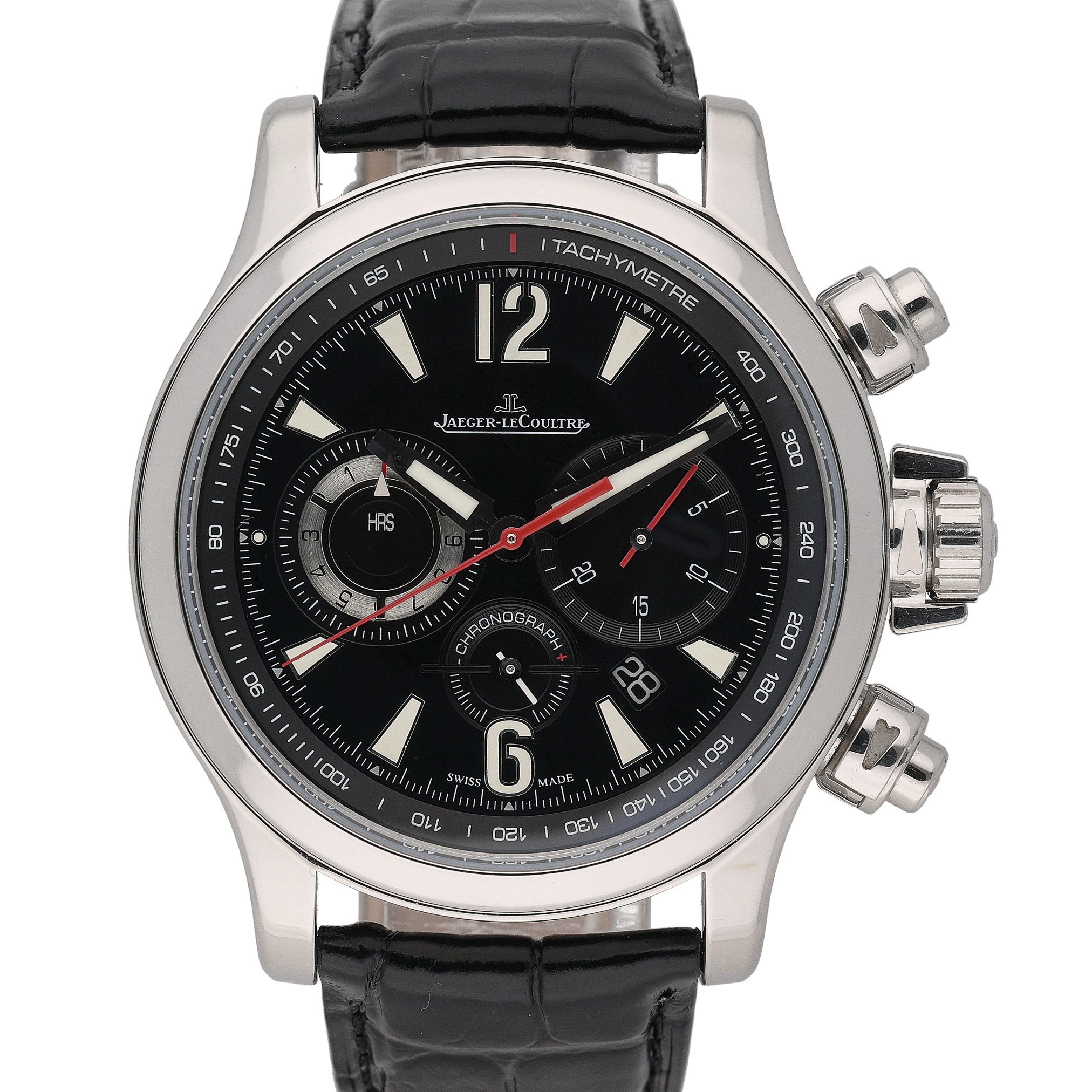This Jaeger-LeCoultre Master Compressor Chronograph 1758421 has a black baton dial and a leather strap. This Jaeger-LeCoultre has undergone a thorough inspection of accuracy, functionality and condition at our Jaeger-LeCoultre certified service centre to determine the level of reconditioning required to meet our strict standards. It has also been checked against our records to ensure authenticity. All our watches have a 24-month warranty for your peace of mind.
