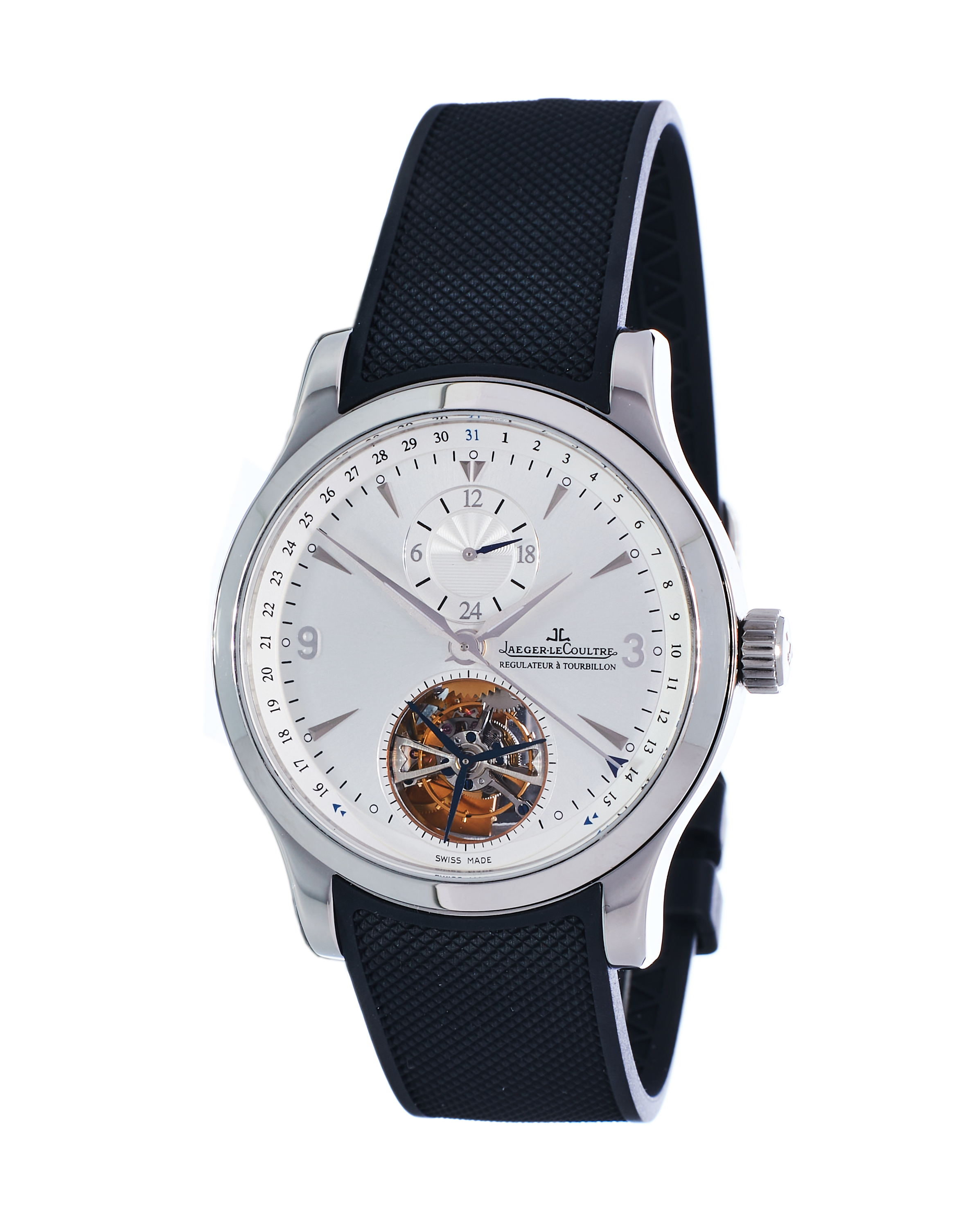 This Jaeger-LeCoultre Master Tourbillon 1658420 has a silver quarter arabic dial and a rubber strap. This Jaeger-LeCoultre has undergone a thorough inspection of accuracy, functionality and condition at our Jaeger-LeCoultre certified service centre to determine the level of reconditioning required to meet our strict standards. It has also been checked against our records to ensure authenticity. All our watches have a 24-month warranty for your peace of mind.