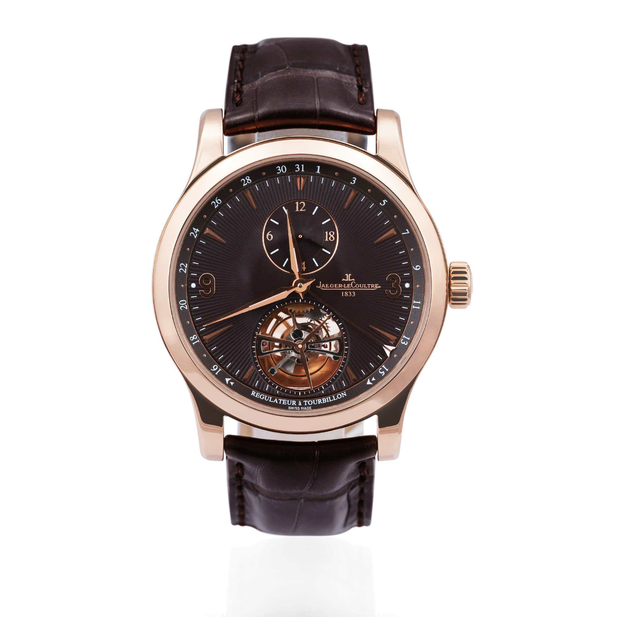 This Jaeger-LeCoultre Master Tourbillon 1662450 has a brown dial and a leather strap. This Jaeger-LeCoultre has undergone a thorough inspection of accuracy, functionality and condition at our Jaeger-LeCoultre certified service centre to determine the level of reconditioning required to meet our strict standards. It has also been checked against our records to ensure authenticity. All our watches have a 24-month warranty for your peace of mind.