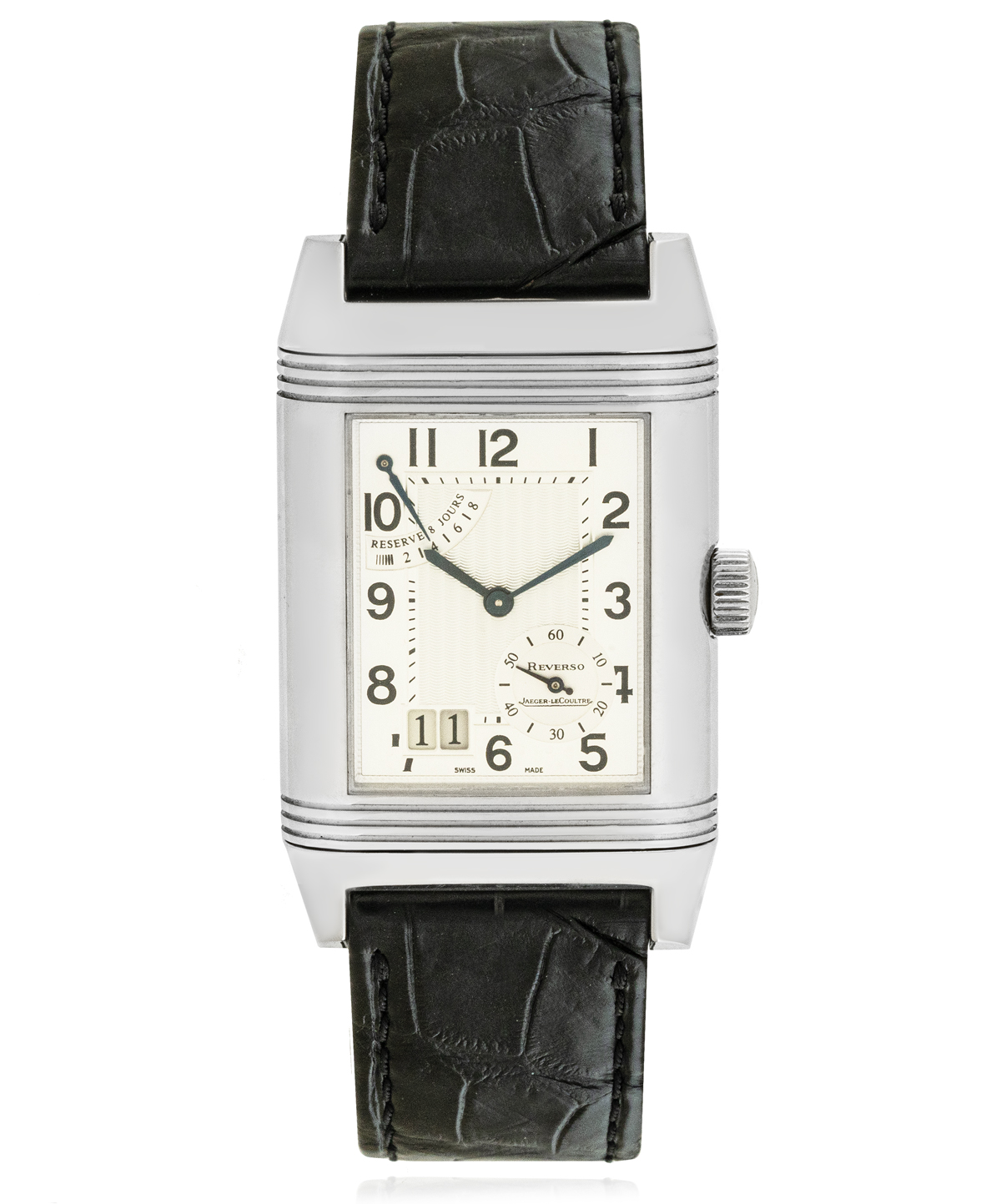 This Jaeger-LeCoultre Reverso Grande Date 3008420 has a silver arabic dial and a leather strap. This Jaeger-LeCoultre has undergone a thorough inspection of accuracy, functionality and condition at our Jaeger-LeCoultre certified service centre to determine the level of reconditioning required to meet our strict standards. It has also been checked against our records to ensure authenticity. All our watches have a 24-month warranty for your peace of mind.