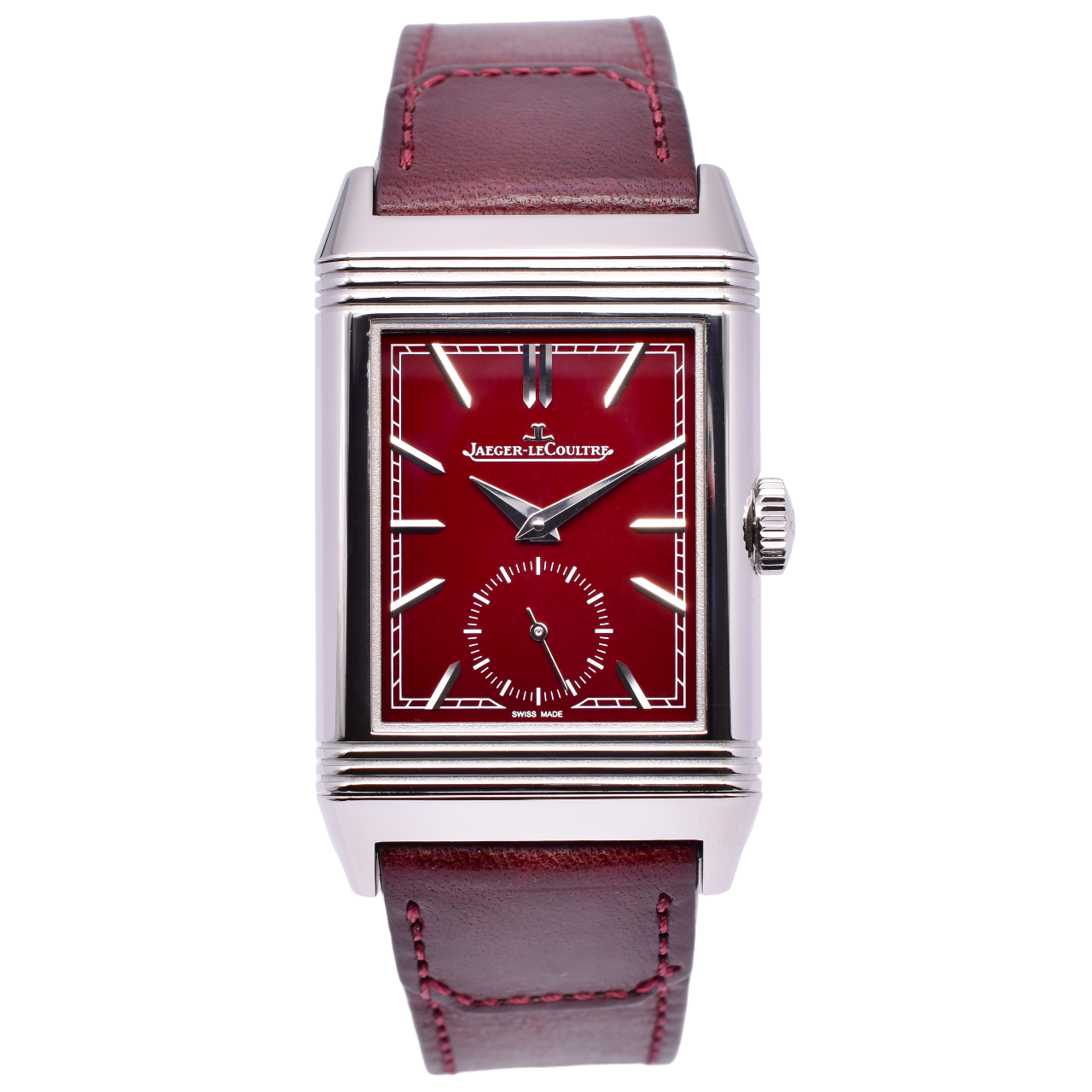 This Jaeger-LeCoultre Reverso Tribute Monoface Small Seconds 397846J has a burgundy baton dial and a leather strap. This Jaeger-LeCoultre has undergone a thorough inspection of accuracy, functionality and condition at our Jaeger-LeCoultre certified service centre to determine the level of reconditioning required to meet our strict standards. It has also been checked against our records to ensure authenticity. Our watches have a 24-month warranty for your peace of mind, in conjunction with any remaining manufacturer’s warranty from new or from service.