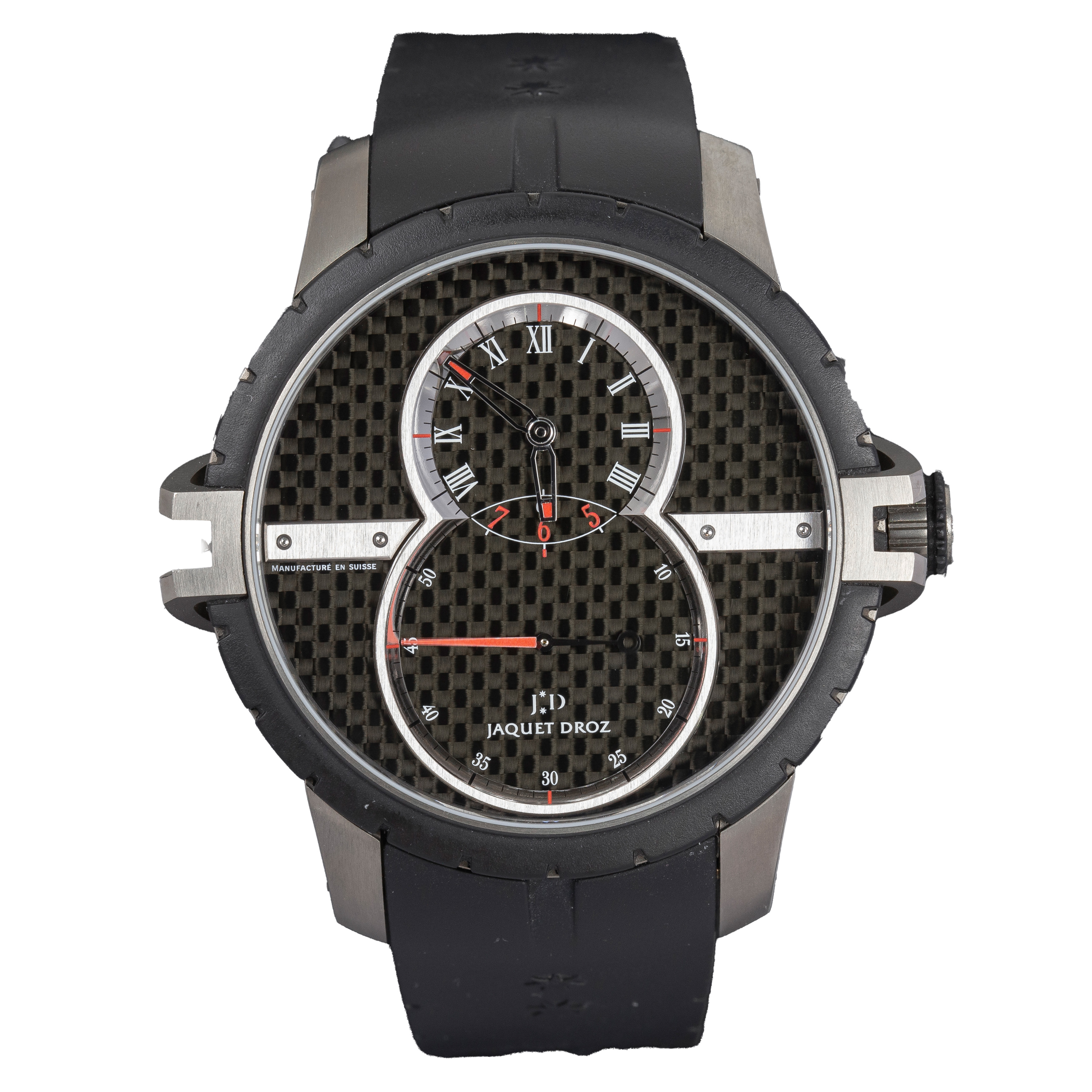 This Jaquet Droz Grande Seconde J029037440 has a black dial and a rubber strap. This Jaquet Droz has undergone a thorough inspection of water resistance, accuracy, functionality and condition to determine the level of reconditioning required to meet our strict standards. It has also been referenced against technical documents and manufacturer records where available to ensure authenticity and a clean history. All our watches have a 24-month warranty for your peace of mind.