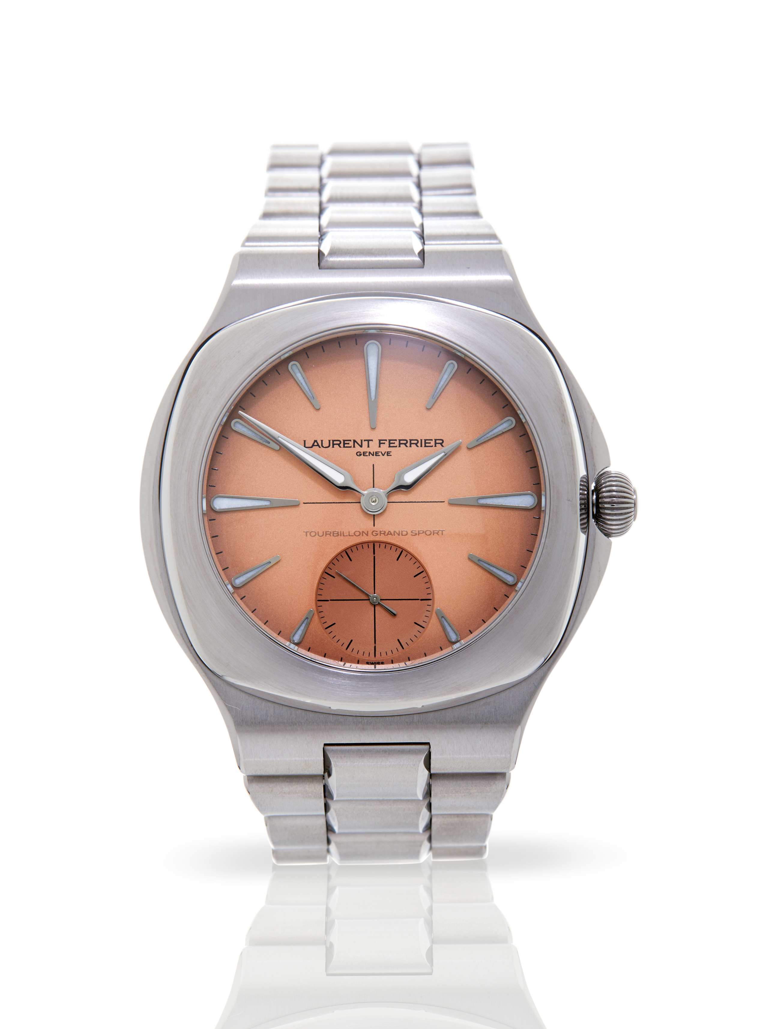 This Laurent Ferrier Grand Sport Toubillon Pursuit LCF044.02.T1.RN1 has a salmon baton dial and a bracelet strap. This Laurent Ferrier has undergone a thorough inspection of water resistance, accuracy, functionality and condition to determine the level of reconditioning required to meet our strict standards. It has also been referenced against technical documents and manufacturer records where available to ensure authenticity and a clean history. Our watches have a 24-month warranty for your peace of mind, in conjunction with any remaining manufacturer’s warranty from new or from service.