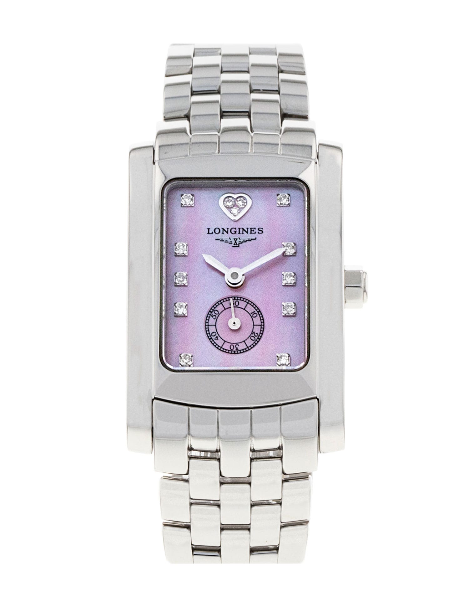 This Longines Dolce Vita L5.155.4.93.6 has a mother of pearl pink - diamond dial and a bracelet strap. This Longines has undergone a thorough inspection of accuracy, functionality and condition at our Longines certified service centre to determine the level of reconditioning required to meet our strict standards. It has also been checked against our records to ensure authenticity. All our watches have a 24-month warranty for your peace of mind.