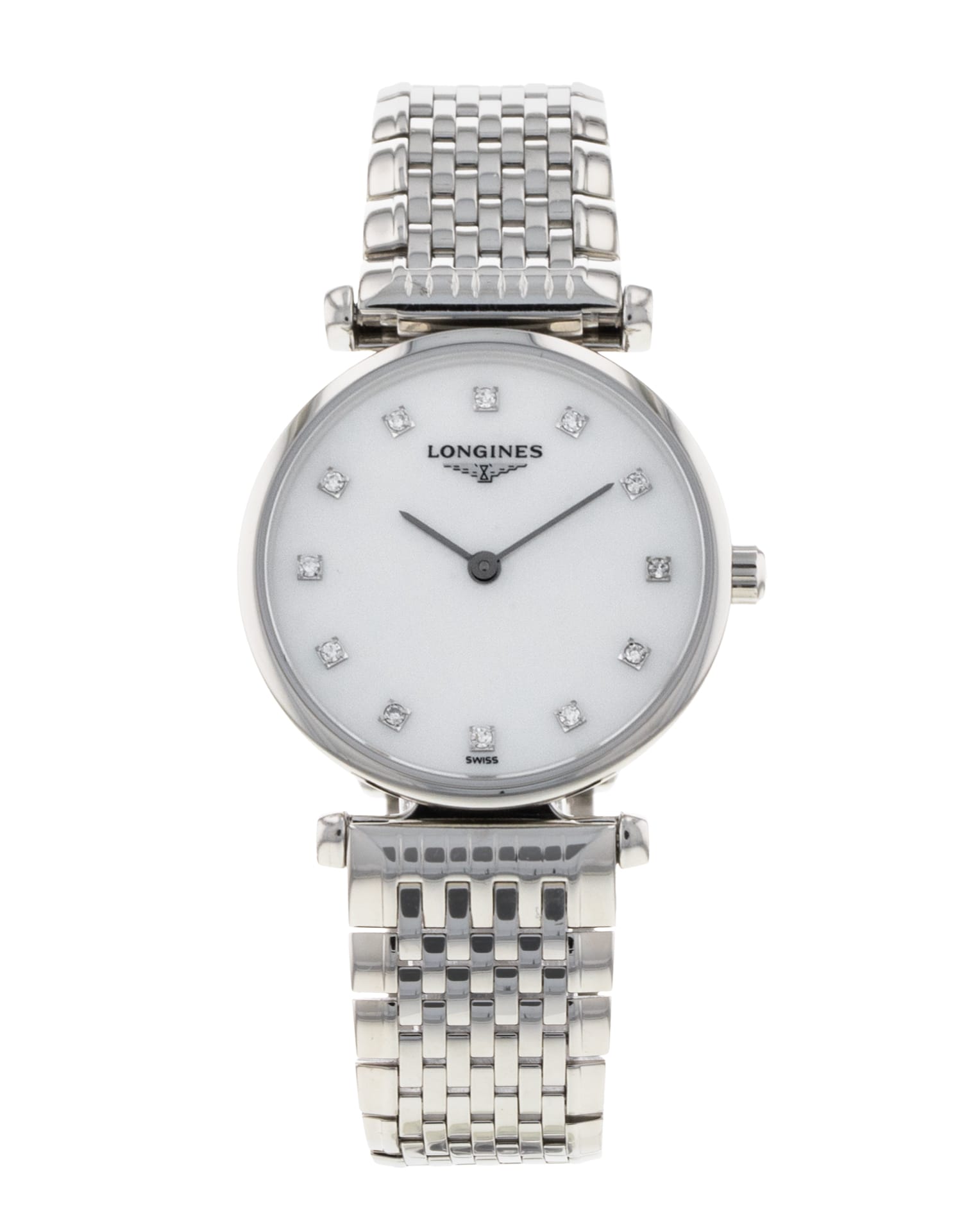 This Longines Grande Classique L4.209.4.87.6 has a mother of pearl white - diamond dial and a bracelet strap. This Longines has undergone a thorough inspection of accuracy, functionality and condition at our Longines certified service centre to determine the level of reconditioning required to meet our strict standards. It has also been checked against our records to ensure authenticity. All our watches have a 24-month warranty for your peace of mind.