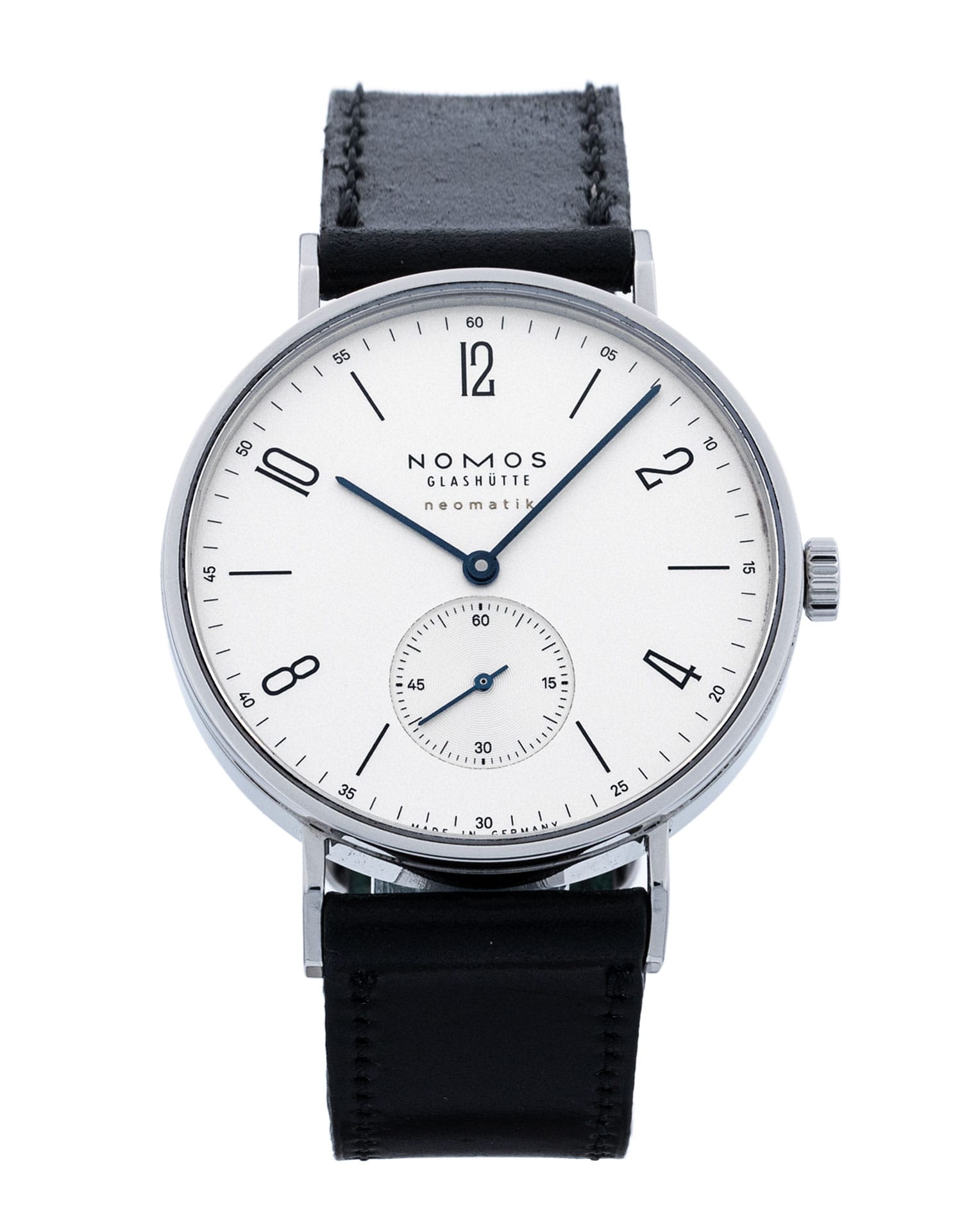 This Nomos Glashutte Tangente 140 has a white arabic dial and a leather strap. This Nomos Glashutte has undergone a thorough inspection of water resistance, accuracy, functionality and condition to determine the level of reconditioning required to meet our strict standards. It has also been referenced against technical documents and manufacturer records where available to ensure authenticity and a clean history. All our watches have a 24-month warranty for your peace of mind.