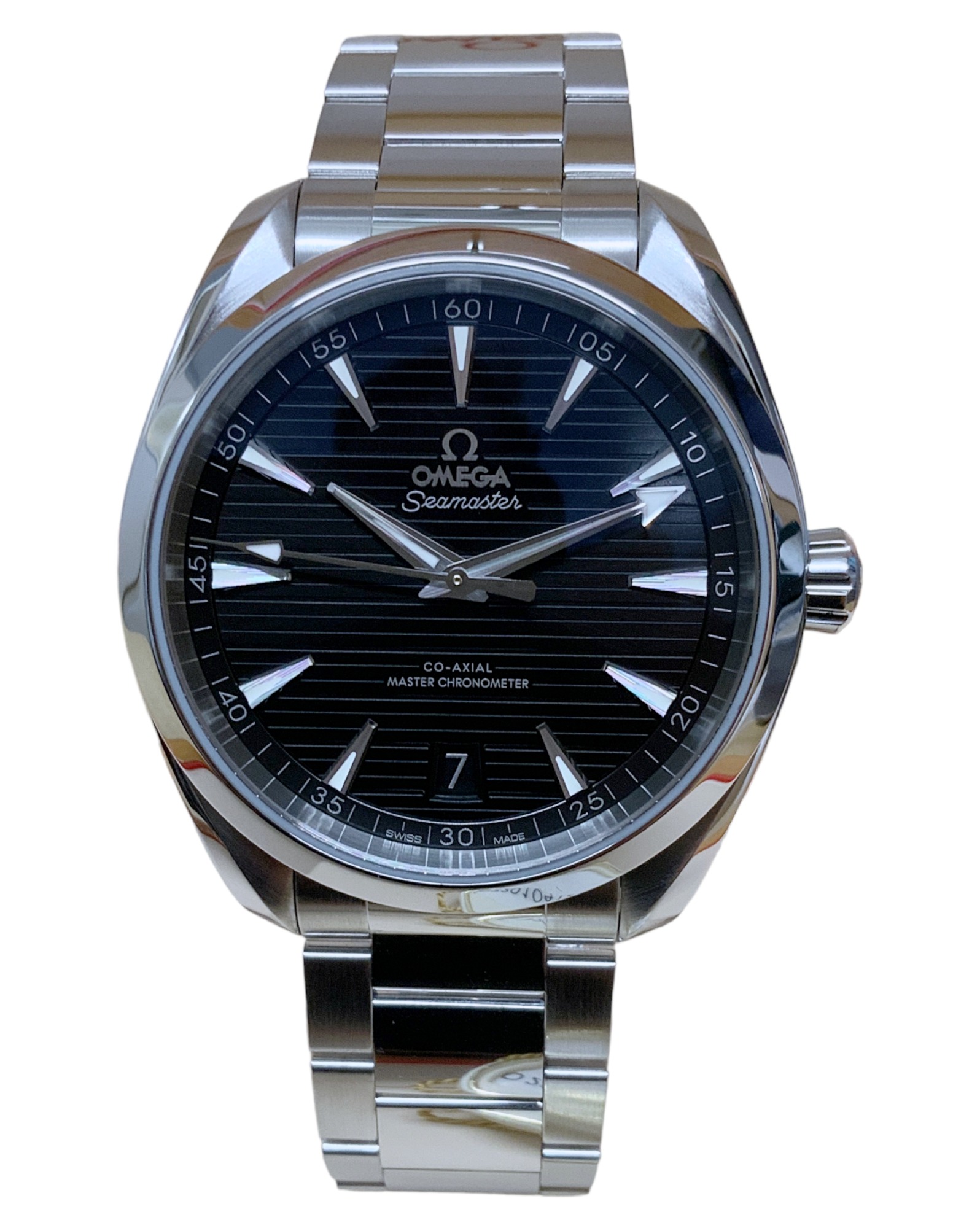 This Omega Aqua Terra 150m Gents 220.10.41.21.01.001 has a black baton dial and a bracelet strap. This Omega has undergone a thorough inspection of accuracy, functionality and condition at our Omega certified service centre to determine the level of reconditioning required to meet our strict standards. It has also been checked against our records to ensure authenticity. Our watches have a 24-month warranty for your peace of mind, in conjunction with any remaining manufacturer’s warranty from new or from service.